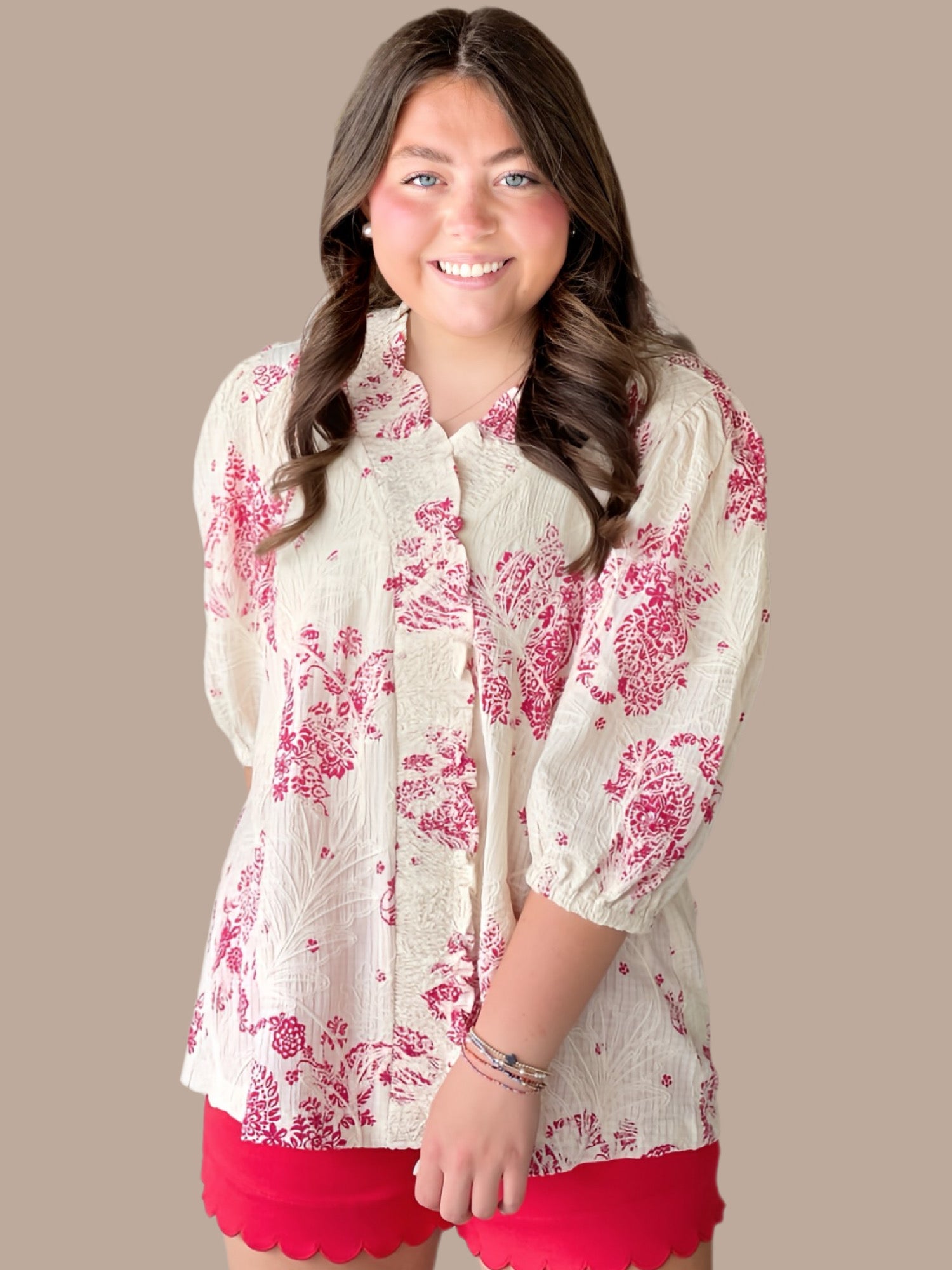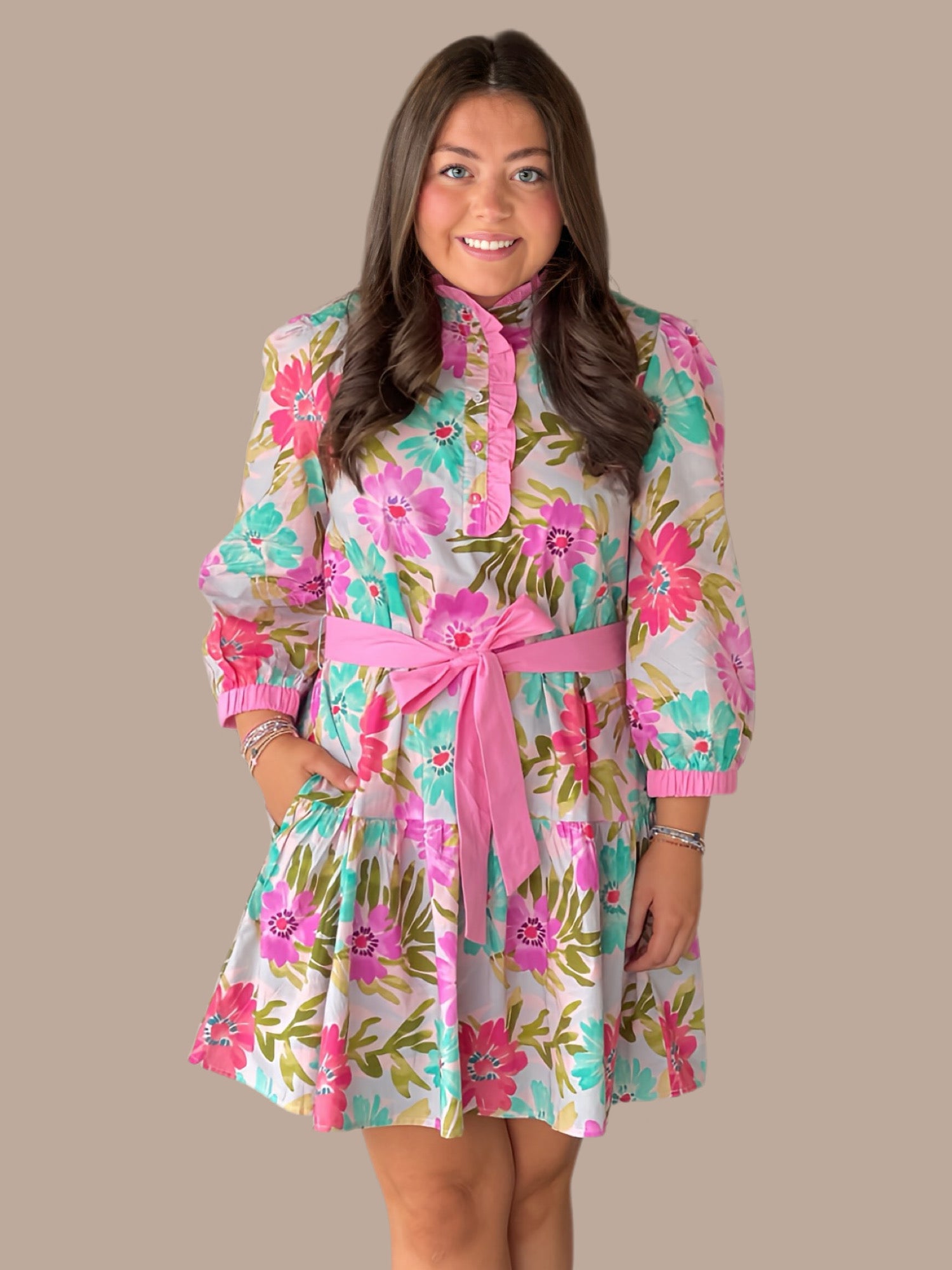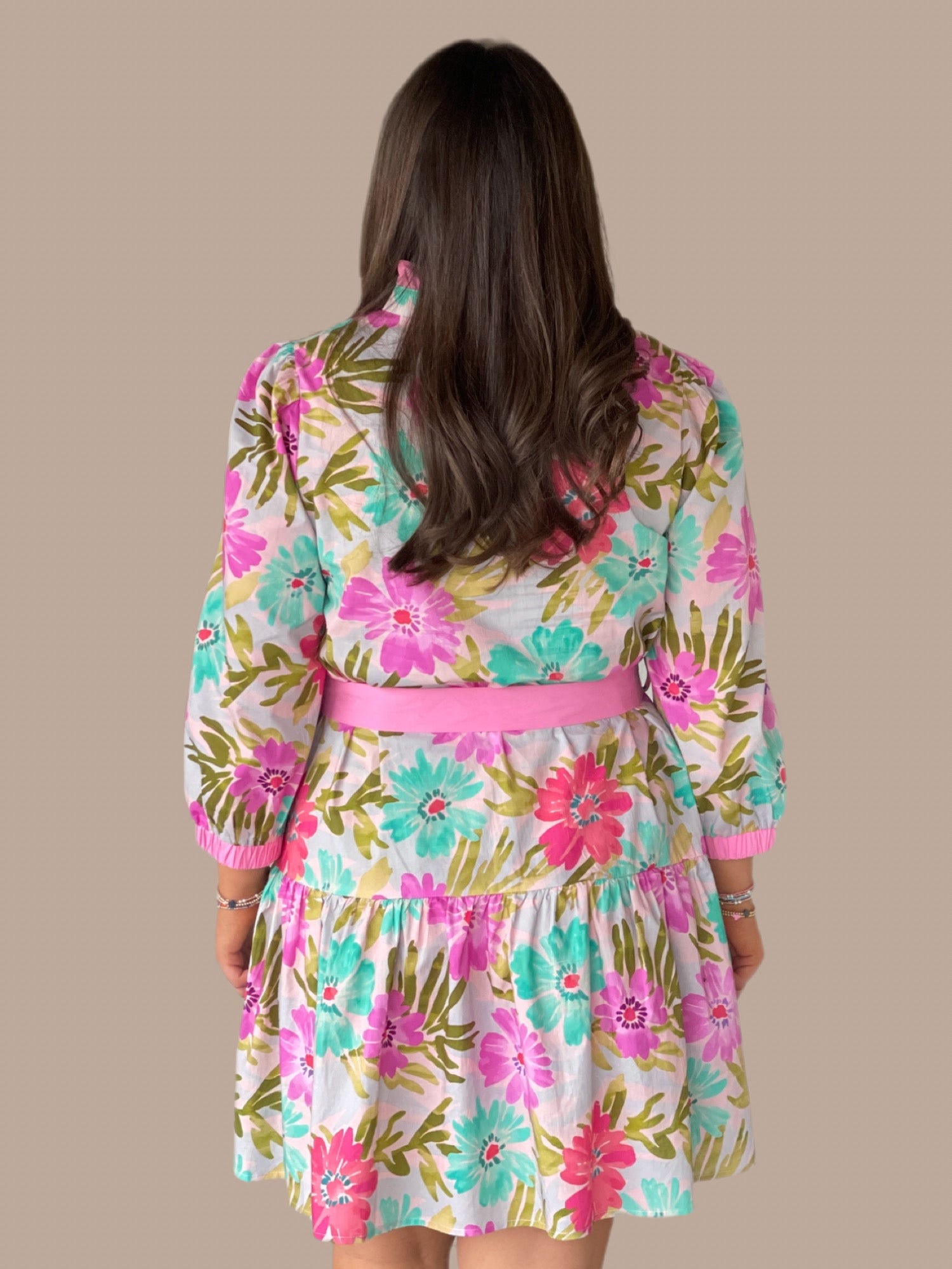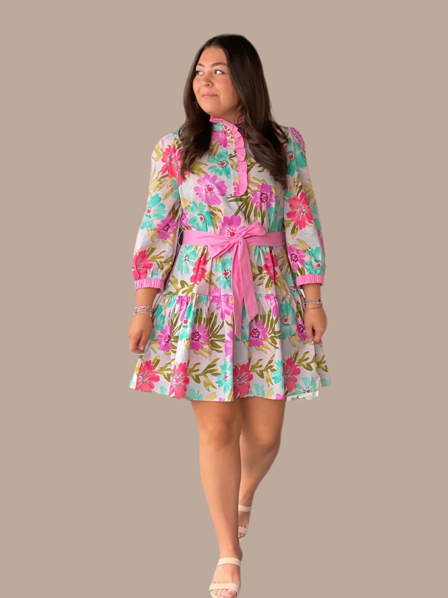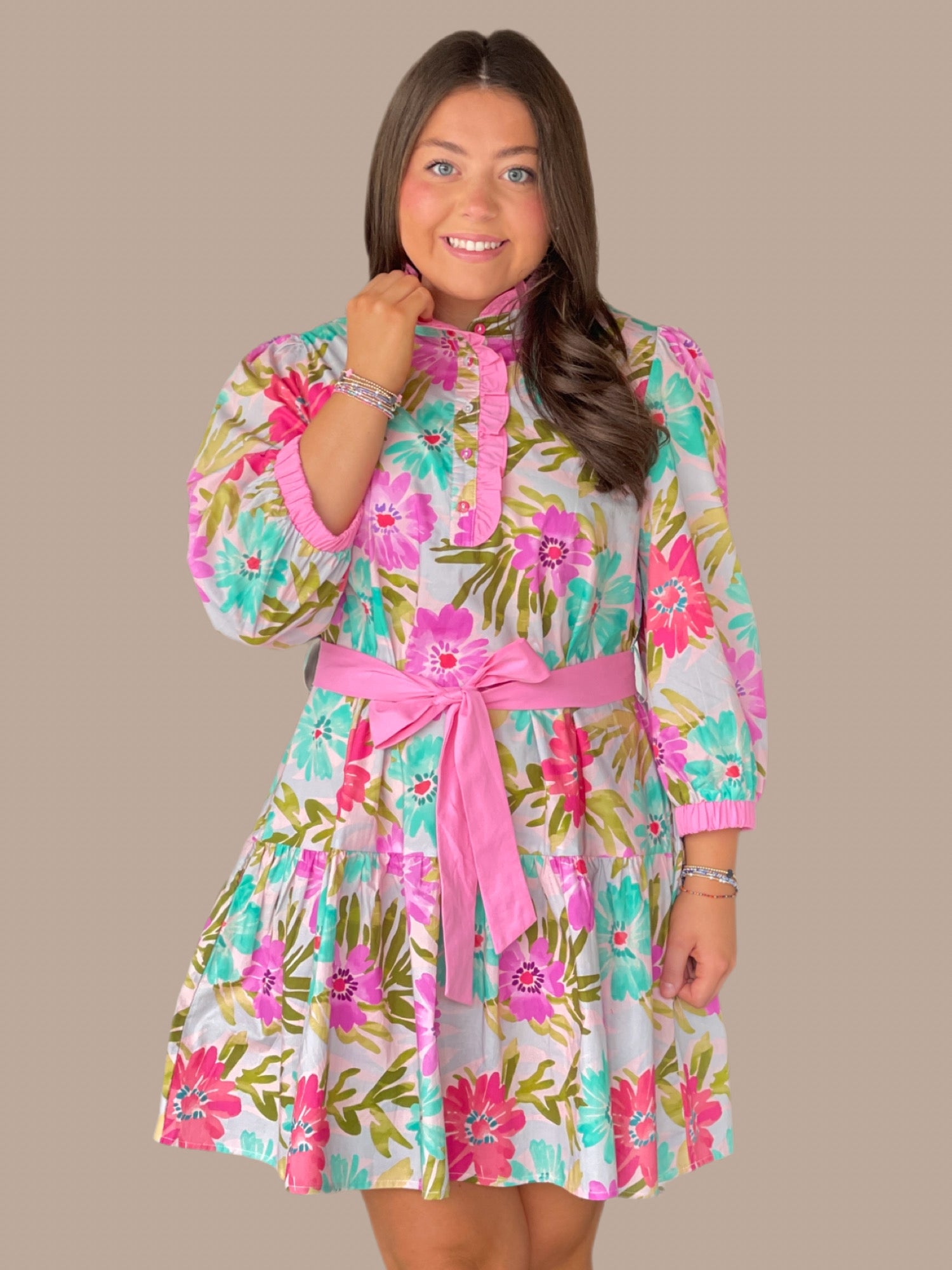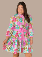 Elevate your seasonal wardrobe with this charming floral dress, designed to balance elegance with effortless style. The romantic ruffled neckline draws attention upward, while three-quarter sleeves provide versatile coverage for any occasion. A front button-up closure allows for easy layering and adjustable styling, and the tiered silhouette creates flattering movement and dimension. The coordinating waist tie cinches the dress at your natural waistline, defining your shape while maintaining a refined aesthetic. Perfect for brunches, garden parties, or casual outings where polished femininity meets comfort.