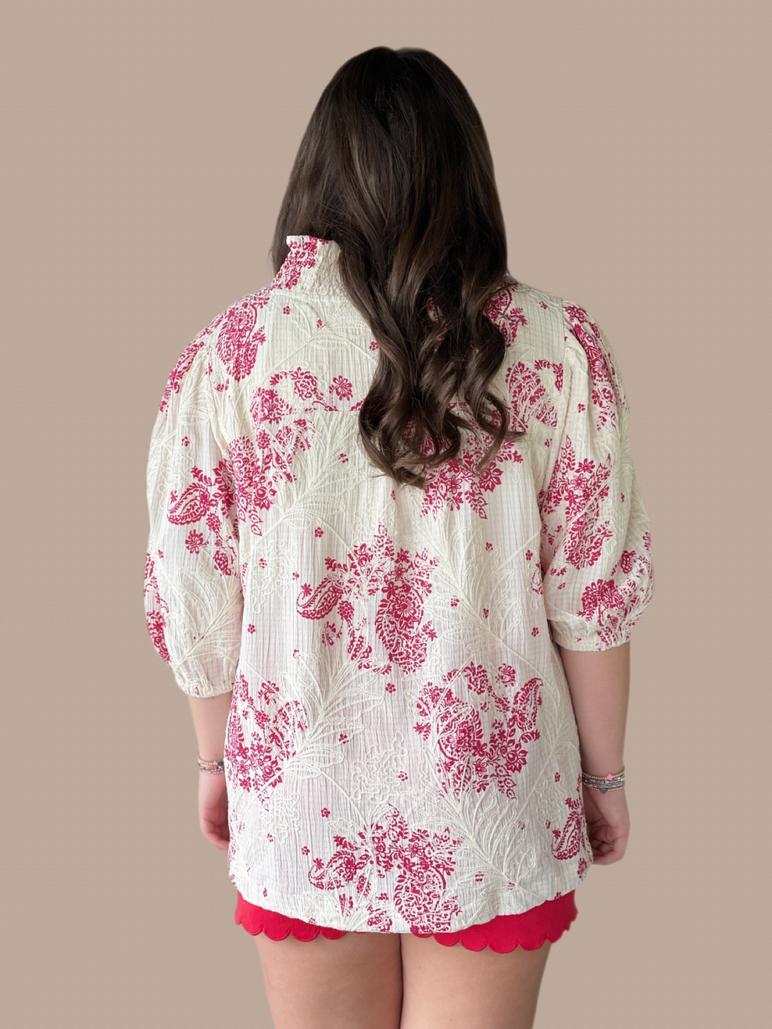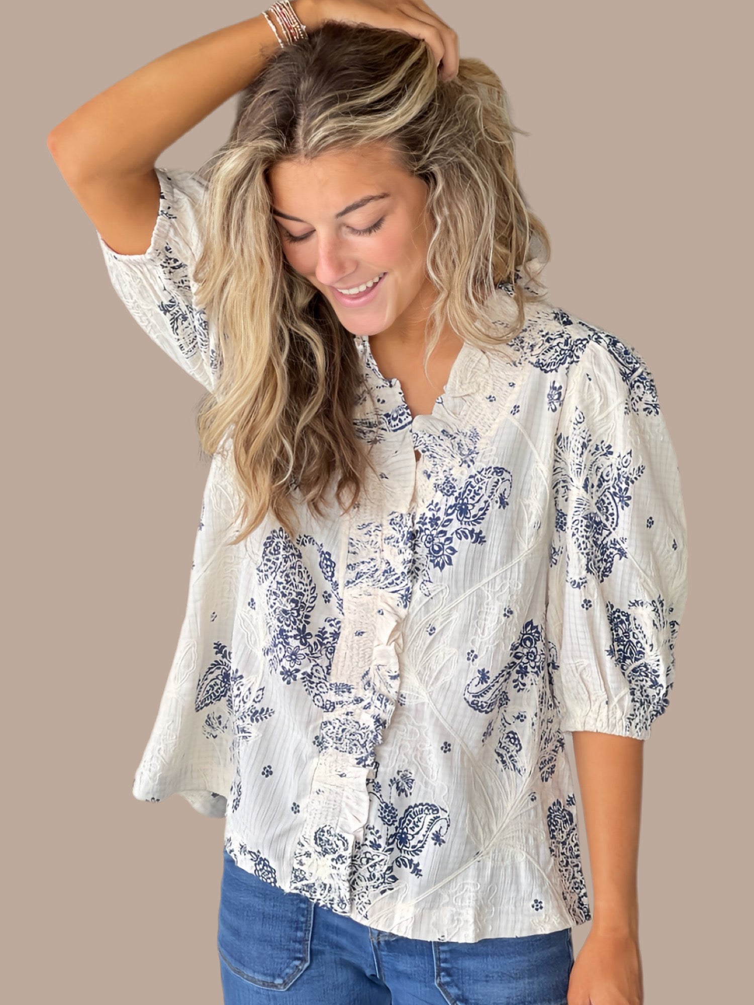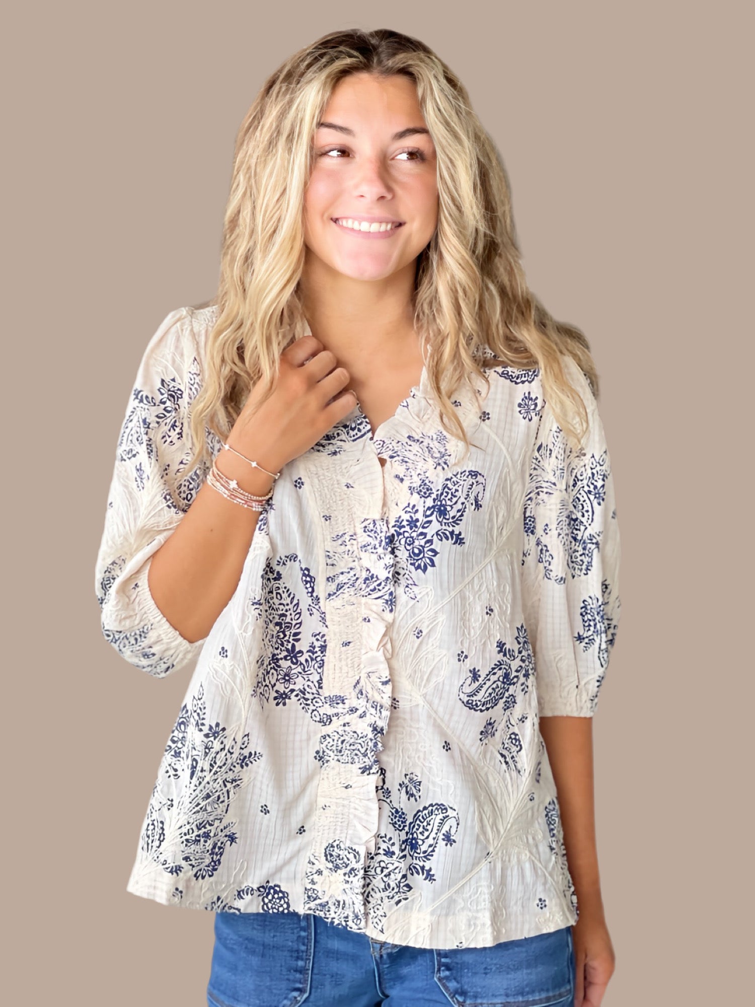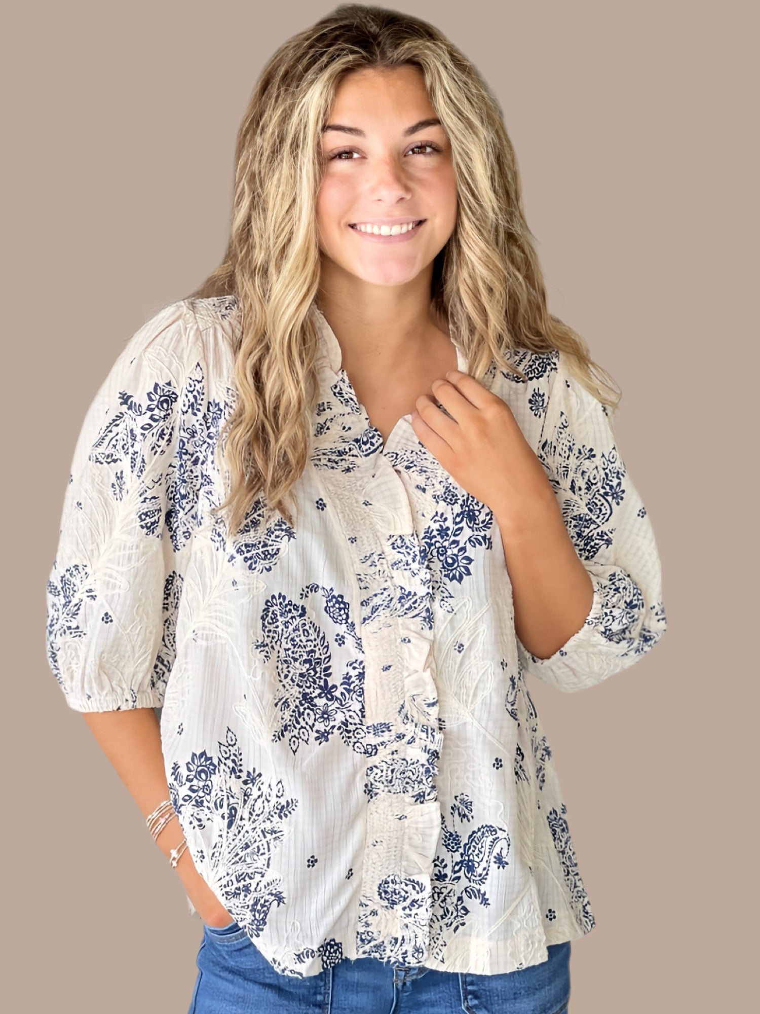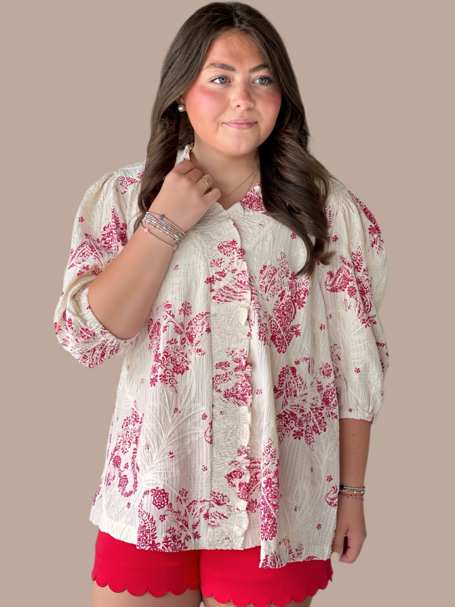 Elevate your seasonal wardrobe with this charming floral dress, designed to balance elegance with effortless style. The romantic ruffled neckline draws attention upward, while three-quarter sleeves provide versatile coverage for any occasion. A front button-up closure allows for easy layering and adjustable styling, and the tiered silhouette creates flattering movement and dimension. The coordinating waist tie cinches the dress at your natural waistline, defining your shape while maintaining a refined aesthetic. Perfect for brunches, garden parties, or casual outings where polished femininity meets comfort.