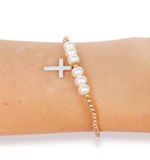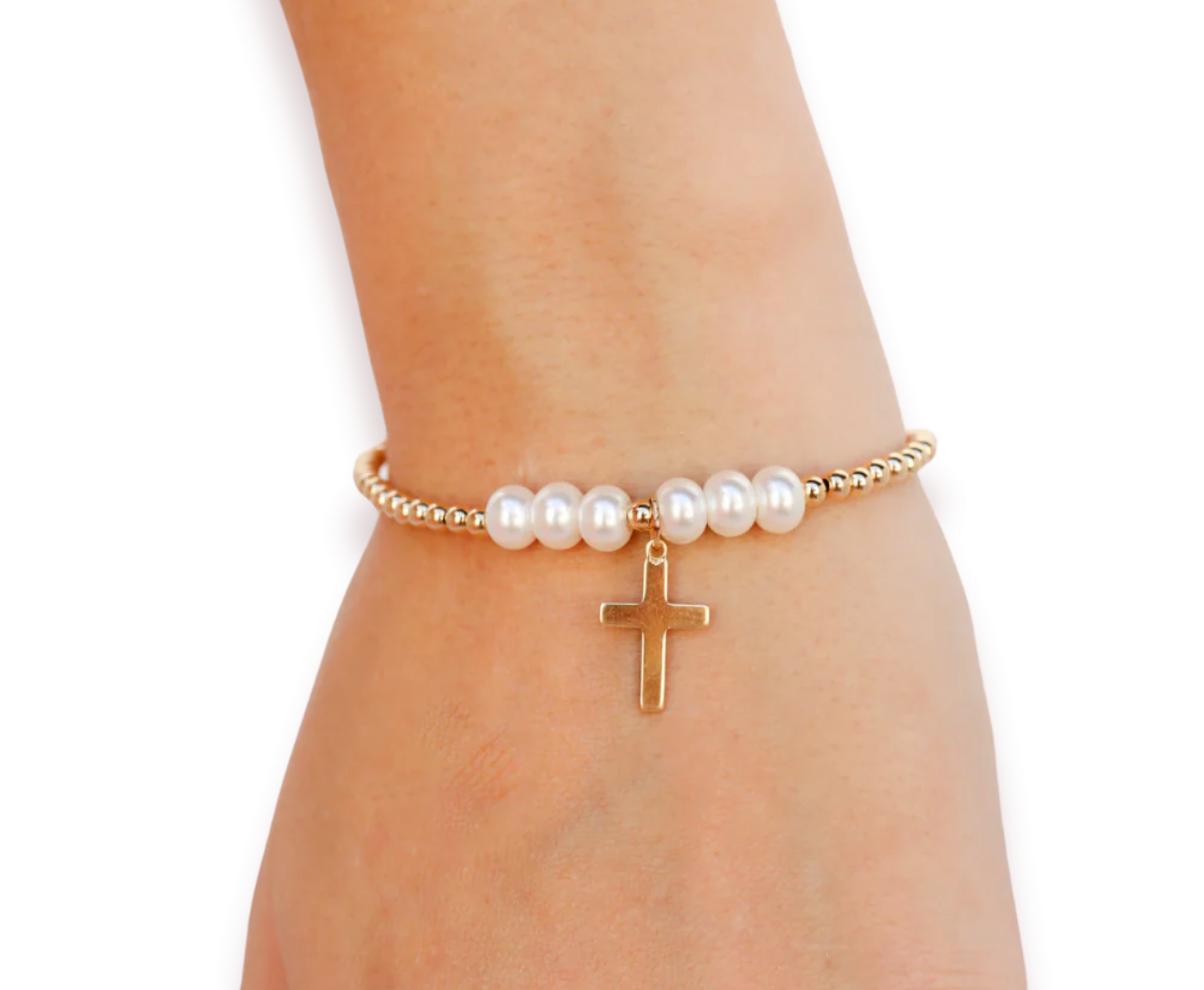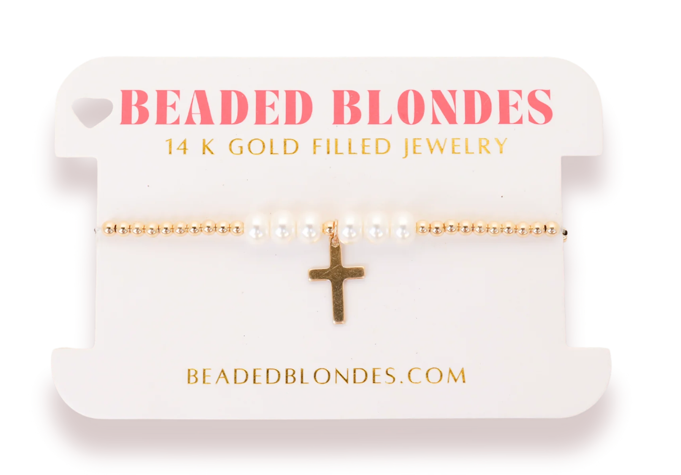 Beaded Blondes Cross Pearl Charm Bracelet includes the charm + bracelet and pearls.