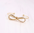 This thin cuff bracelet has a classic yet fun look! It features a double layered bow with a textured, shiny metal finish. Adjusts to fit most wrists.