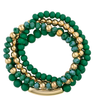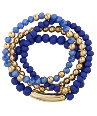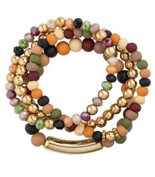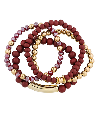 The Golden Mix Bracelet is a modern statement piece featuring 4 rows of wood, glass, metal, and stretch materials. This unique design is sure to draw attention with its eye-catching mix of textures and materials.