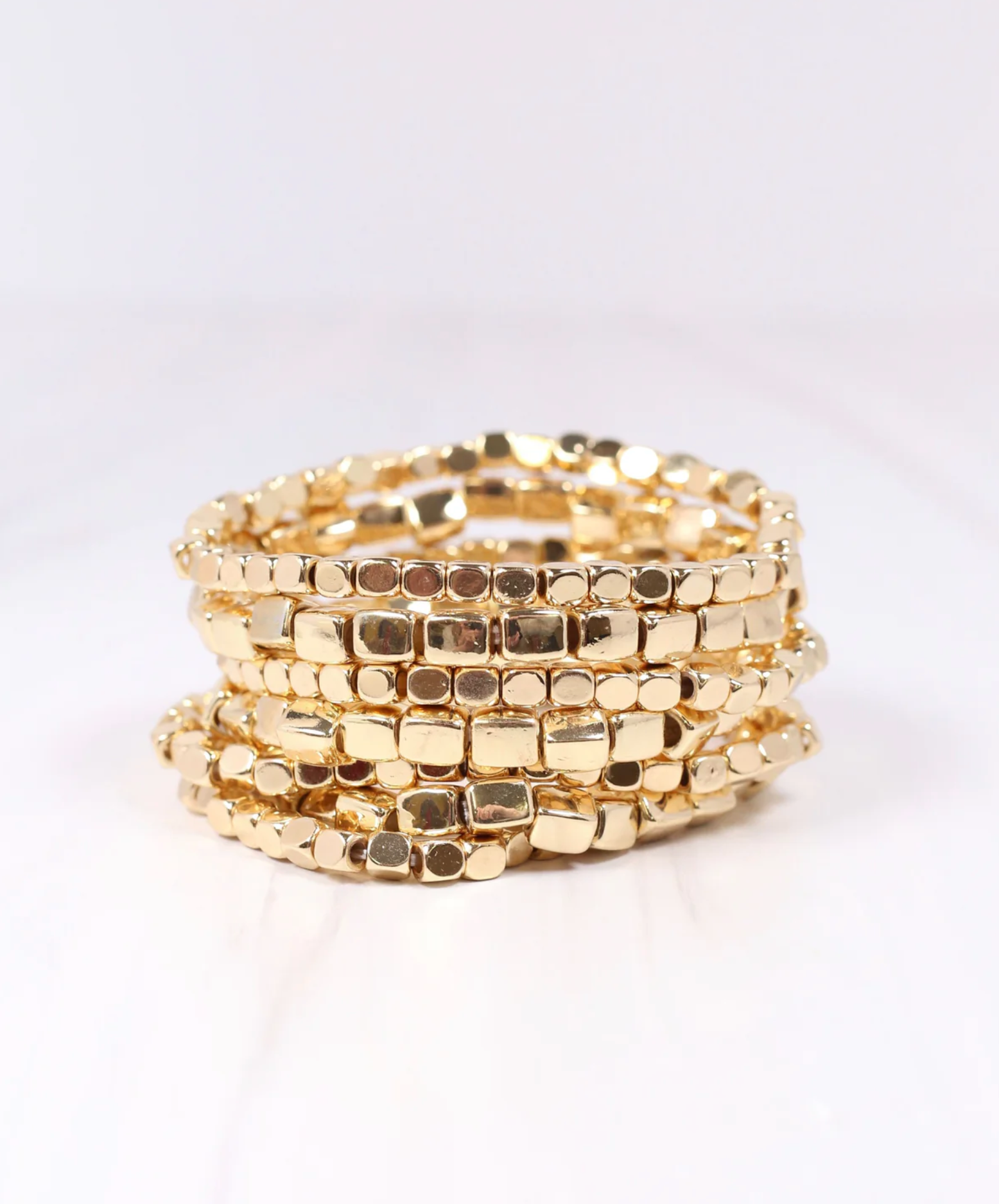 This bracelet set comes with seven individual strands. Each piece is made of shiny, square metal beads with a worn finish. Stretch to fit most wrists.