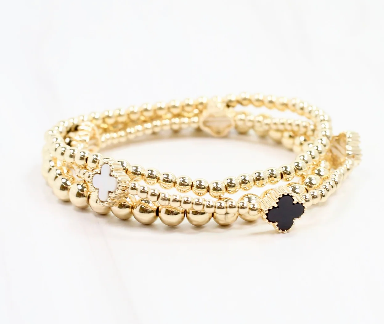 This bracelet set has three individual strands each lined with a different sized beading. One strand features white opal and black clover accents as well. Stretches to fit most wrists.