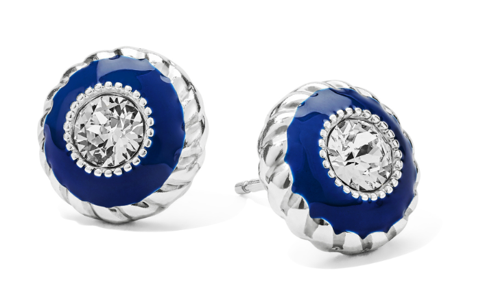 Surrounded by a halo of blue hand-applied enamel, these silver post earrings with brilliant diamond-like fine quality crystals add sparkle to your look.