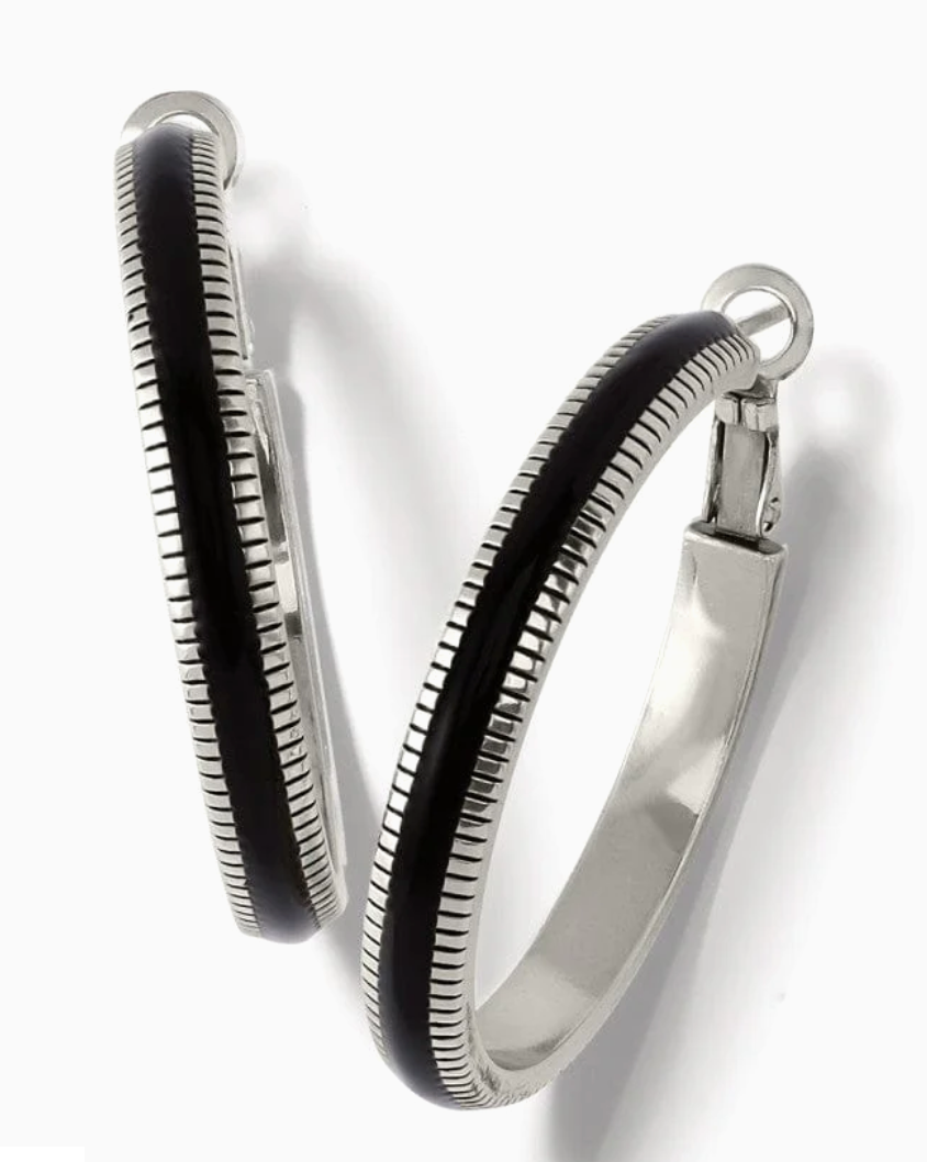 These beautiful slim large hoops have fine etched textured lines outlining the silver edge and encasing the center band – a classic statement hoop with refined details.