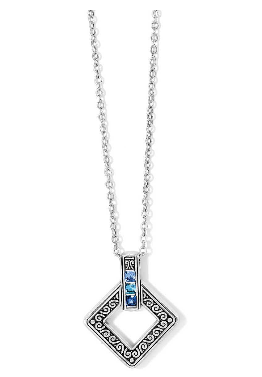 A new square shape adds freshness to this ethereal crystal necklace in cool blue with finely detailed silver scrolls that pay homage to Brighton’s heritage.