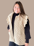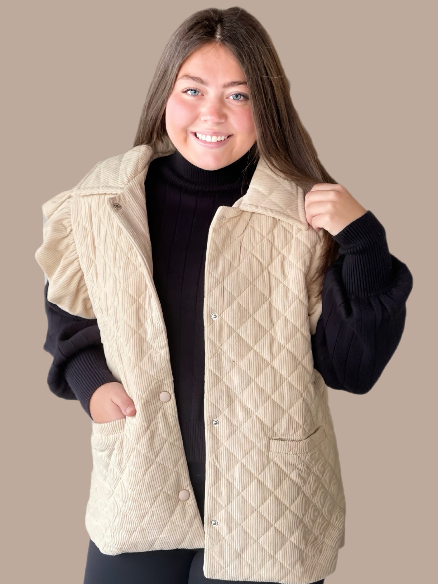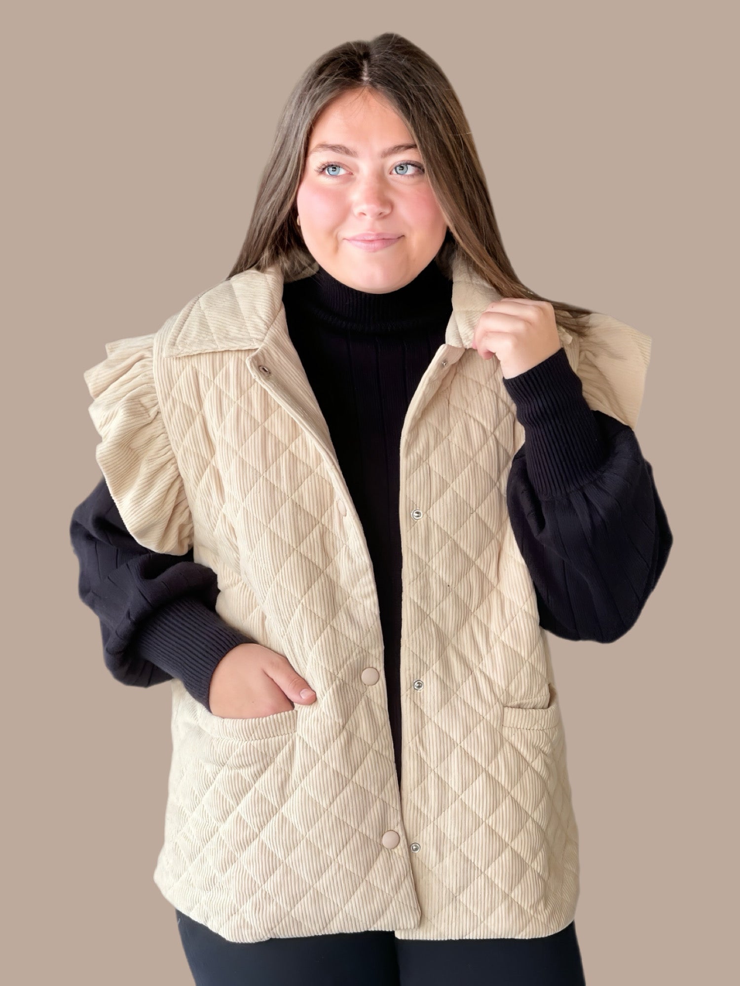 Elevate your layering game with this sophisticated corduroy quilted vest, featuring distinctive ruffle sleeves that add dimension and movement to any ensemble. The quilted construction provides lightweight warmth without bulk, while the textured corduroy fabric delivers timeless appeal and durability. Perfect for transitional seasons, this versatile piece pairs effortlessly over tees, blouses, or sweaters for polished, intentional styling. The ruffle detailing at the sleeves introduces a refined touch of personality, making it an essential addition to a well-curated wardrobe.