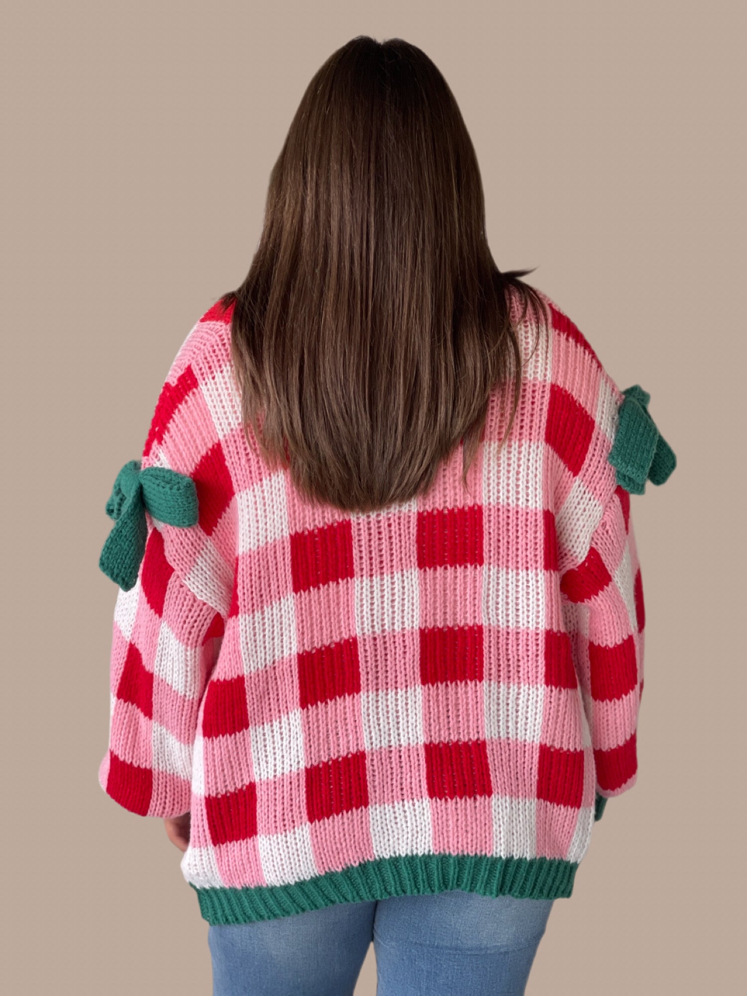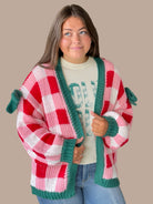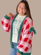 This open-front Christmas cardigan combines festive charm with sophisticated comfort. Featuring a ribbon detail that adds a delicate, holiday-inspired accent, it's perfect for layering over your favorite seasonal outfits. Crafted to provide warmth without bulk, this sweater cardigan is an elegant choice for holiday gatherings and casual winter wear alike.