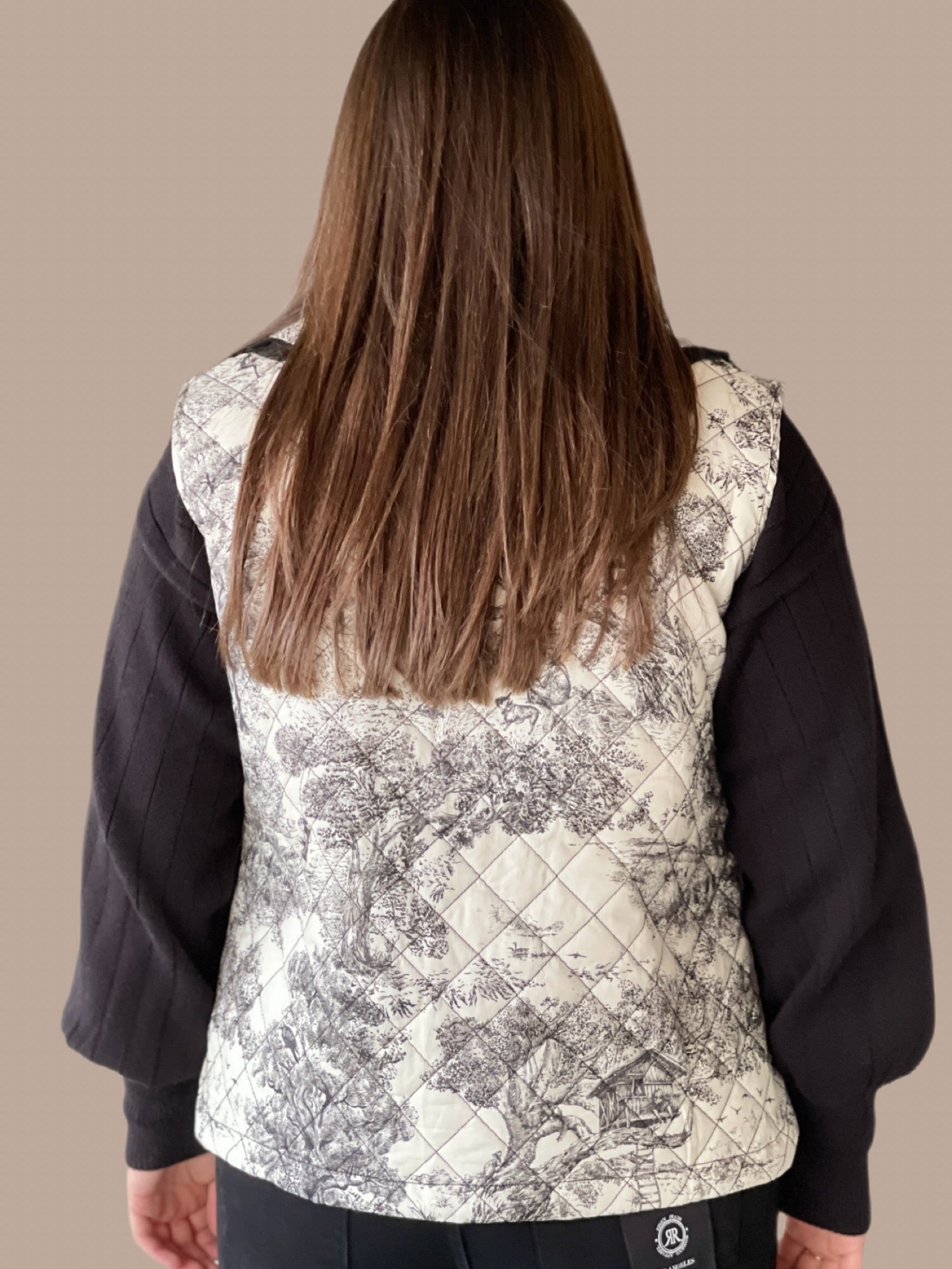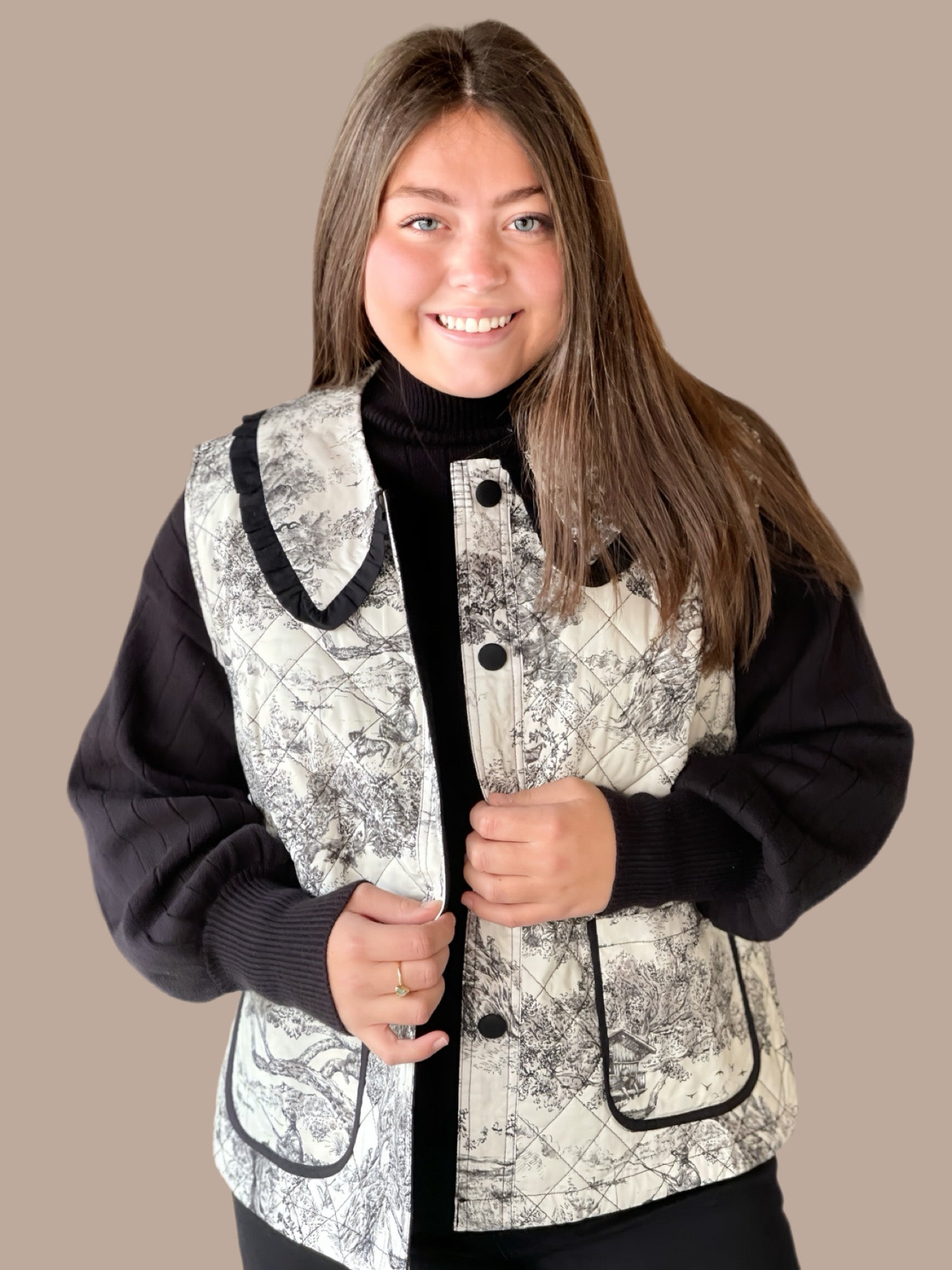 Elevate your layering game with this sophisticated toile quilted vest, featuring a distinctive ruffle collar that adds refined texture and movement. The quilted construction provides lightweight warmth without bulk, making it ideal for transitional seasons or as a polished layer over your favorite pieces. The toile pattern brings timeless elegance to any ensemble, while the structured silhouette ensures a flattering fit. Perfect for both casual and elevated occasions, this vest seamlessly bridges style and practicality.