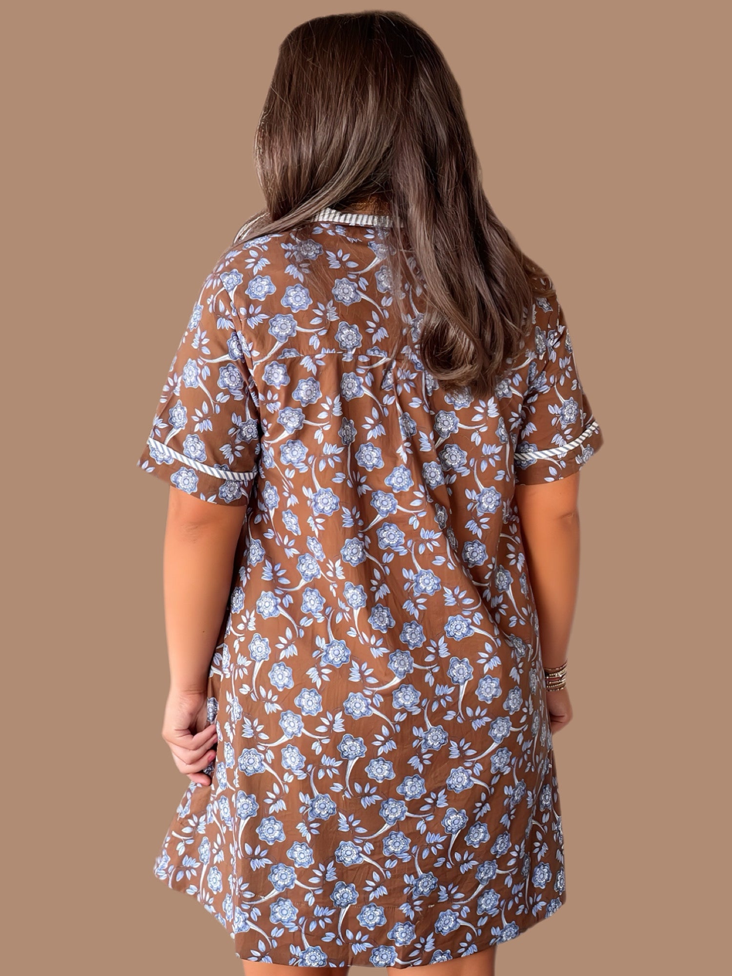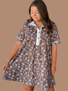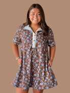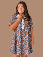 "The Autumn Skies Colorblock Dress is a versatile addition to your wardrobe. Its elegant blue and brown design effortlessly combines style and comfort. Made with high-quality materials, this dress is perfect for any occasion. Upgrade your look with this must-have piece."