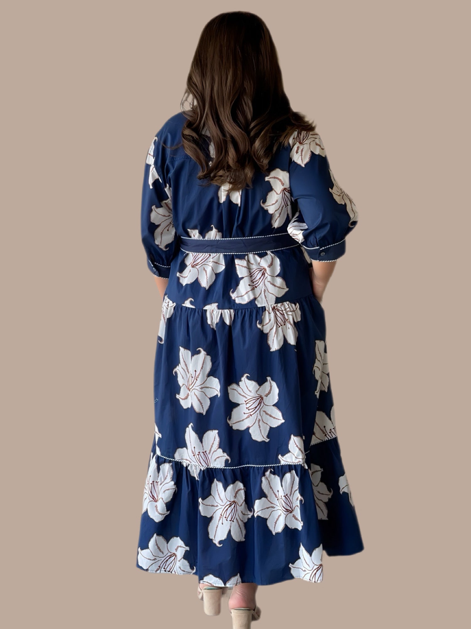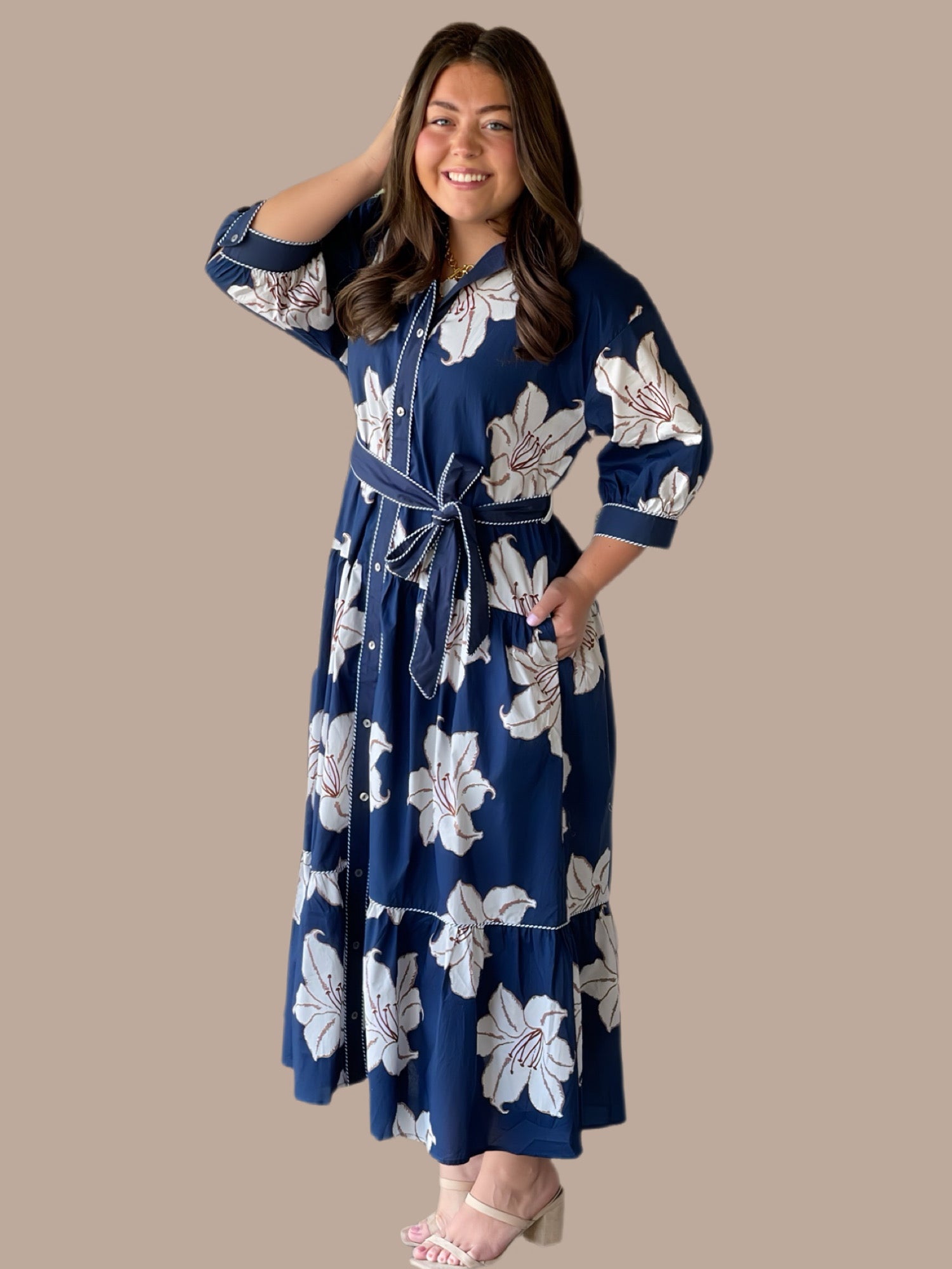 This lightweight woven midi dress features a charming floral print and practical 3/4 sleeves, offering both style and comfort. It includes a button closure at the front and a detachable waist tie belt to customize the fit. Thoughtfully designed with side pockets and a lined, non-sheer fabric, it ensures both functionality and modesty throughout the day. Ideal for versatile wear, this dress combines careful detailing with effortless elegance.