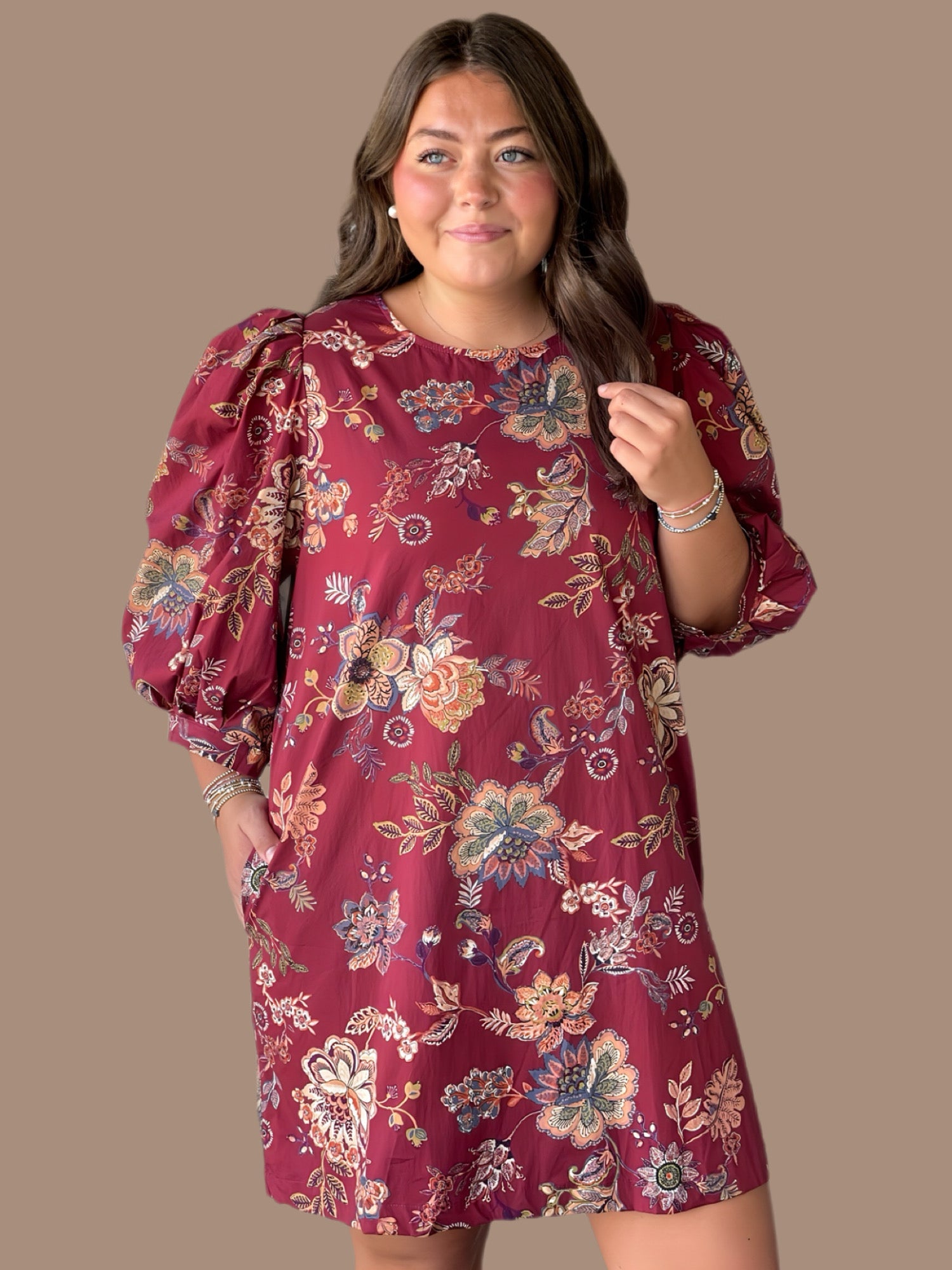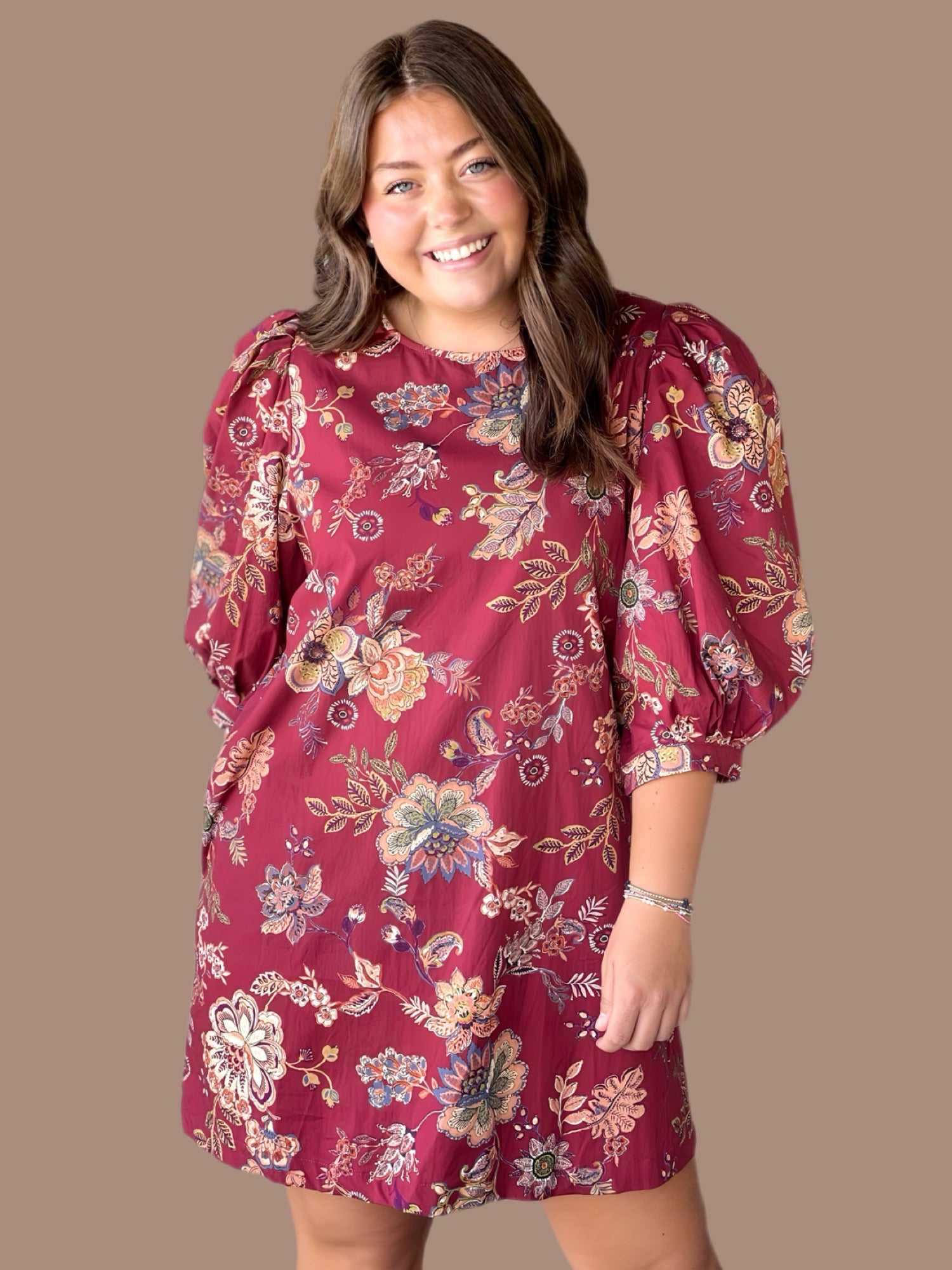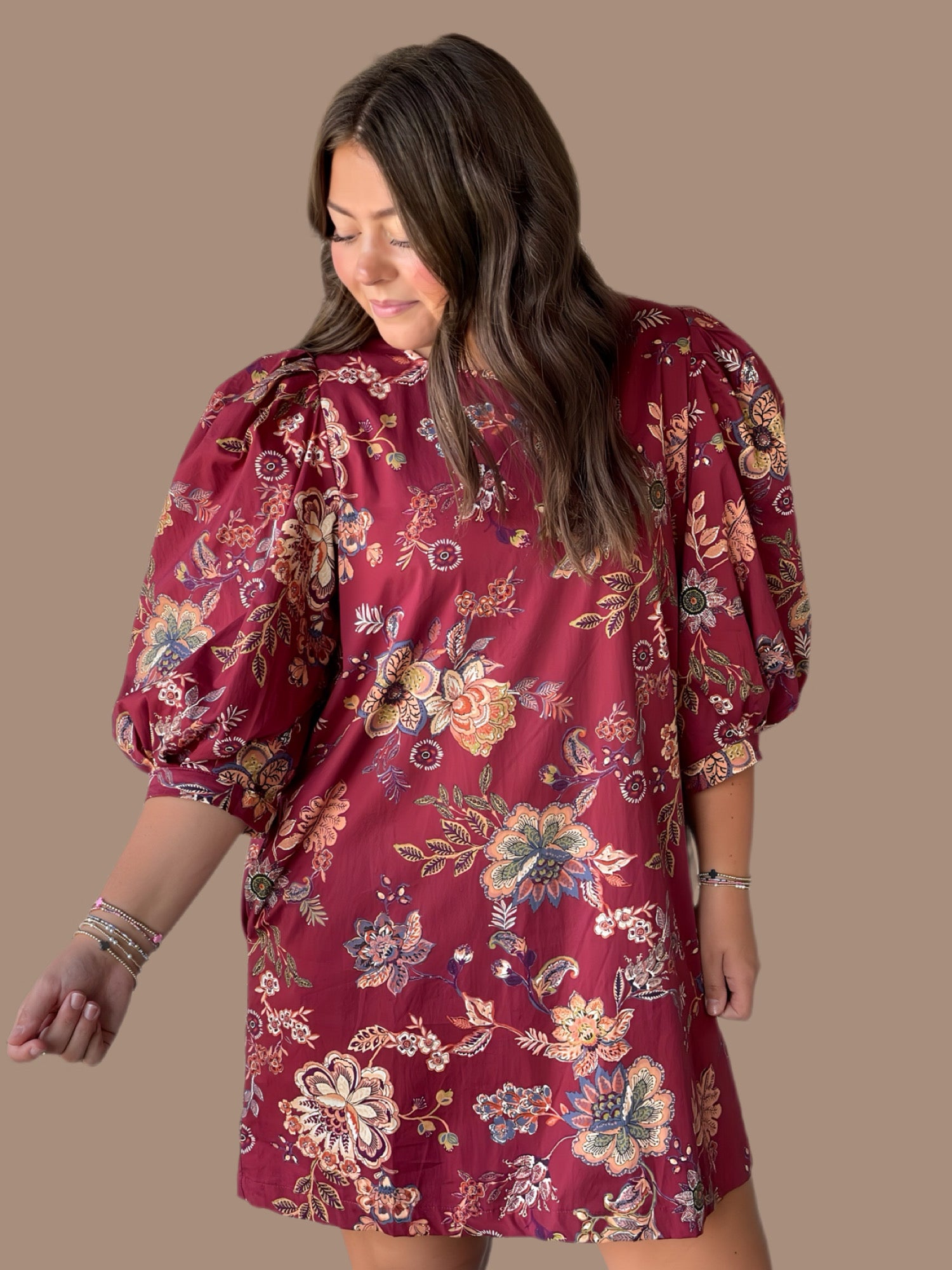 This mini dress showcases a delicate floral print with elegant elbow puff sleeves and a classic round neckline. Crafted from medium-weight woven fabric, it offers a comfortable, non-sheer wear. The dress is fully lined for a smooth fit and features a discreet button closure at the back, ensuring both style and ease. Ideal for refined day-to-night occasions, it combines timeless design with expert tailoring.