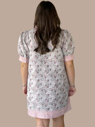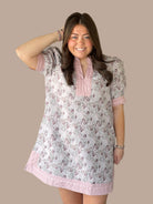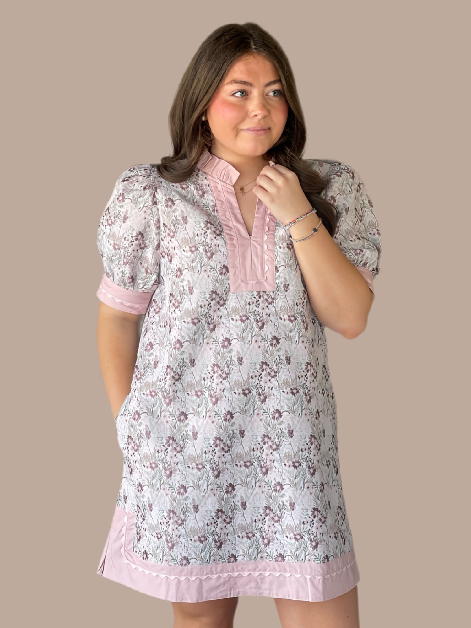 Elevate your wardrobe with this charming floral jacquard shift dress, designed for effortless sophistication. The puff sleeves add a touch of vintage-inspired elegance, while the ruffled neckline and ric-rac trim create delightful textural details. A solid contrast panel grounds the design, and the practical side pockets offer everyday functionality. The subtle side slit provides comfortable movement without compromising the dress's polished silhouette. Perfect for transitional seasons, this piece transitions seamlessly from casual outings to more refined occasions.