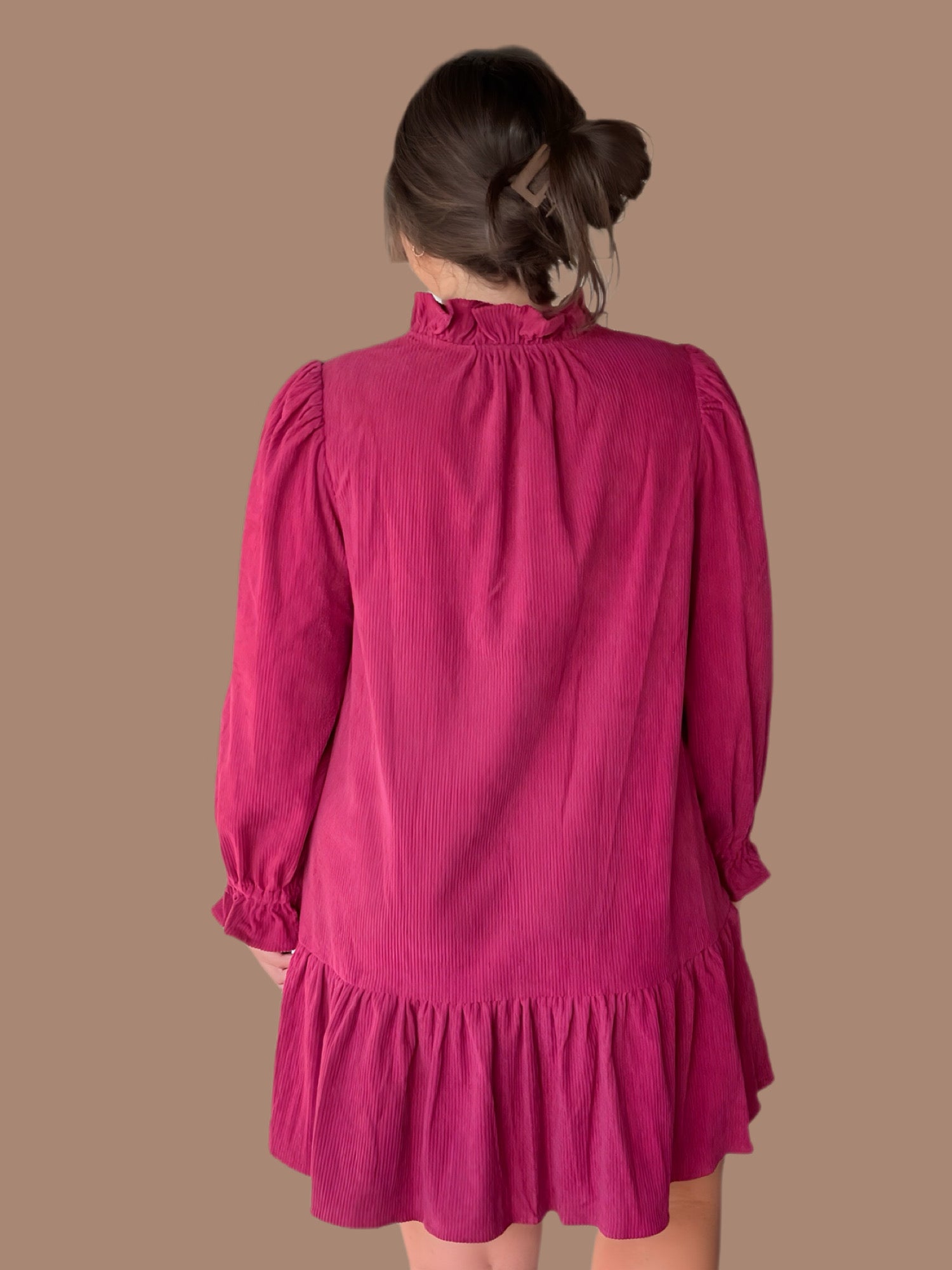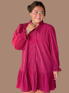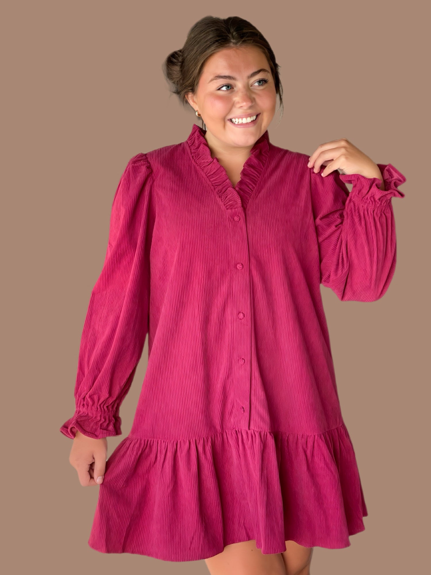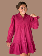 This Corduroy Cutie Babydoll Dress features a ruffle-trim V-neckline and a tiered babydoll silhouette that offers a flattering, relaxed fit. Crafted from soft corduroy fabric, it ensures comfort and a textured look. The long sleeves are finished with smocked ruffle cuffs for refined detail. Designed without lining, this dress combines lightweight wearability with classic autumnal style.