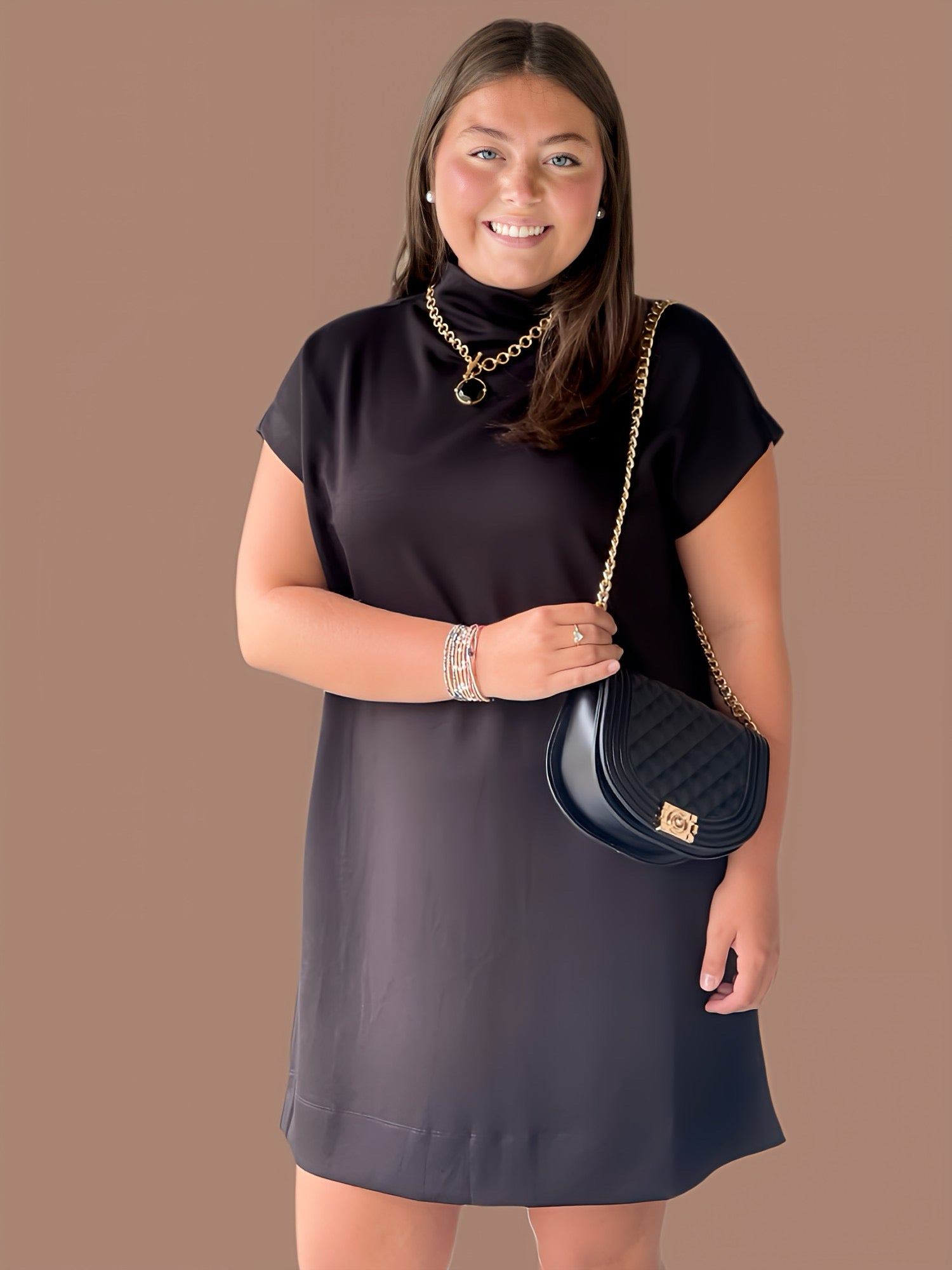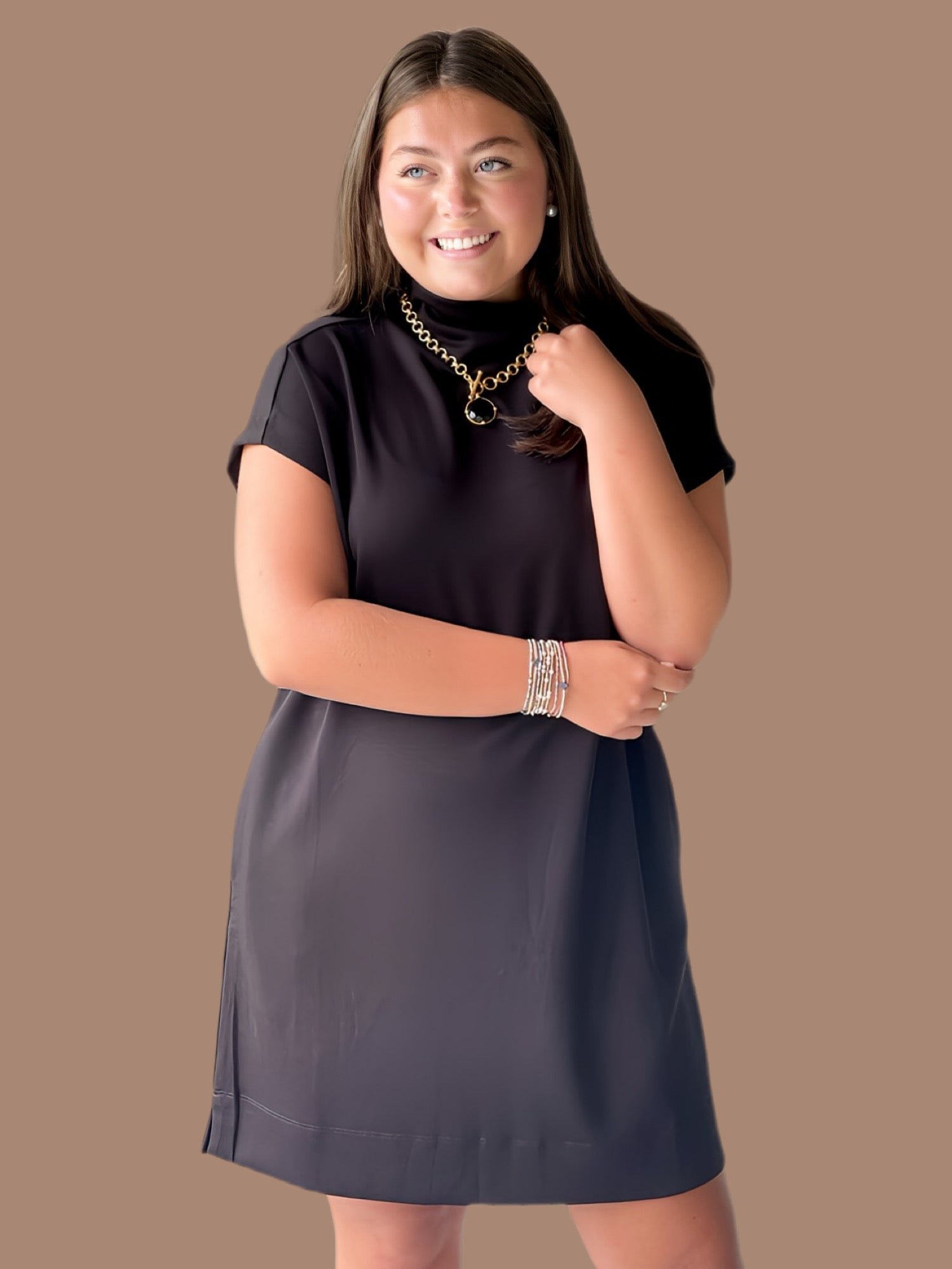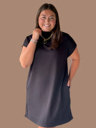 This mock neck pullover mini dress is lightweight, comfy, and yes — it has pockets. 🖤