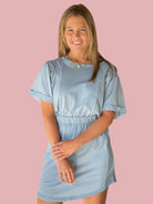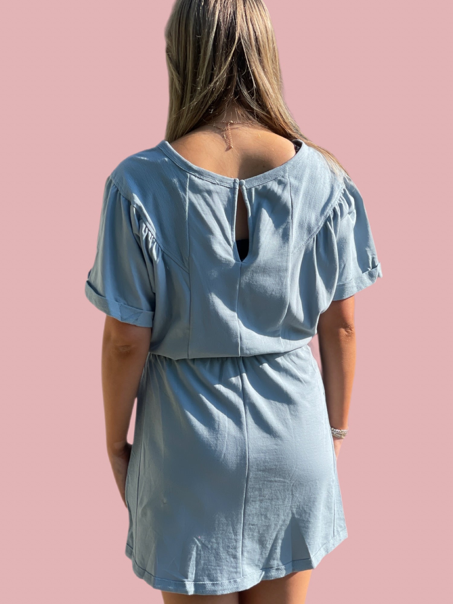 This French terry dress features an elastic waistband for a comfortable fit. With a back keyhole, this dress is stylish and versatile. The model is 5'8" and all measurements are approximate. This dress is not lined.