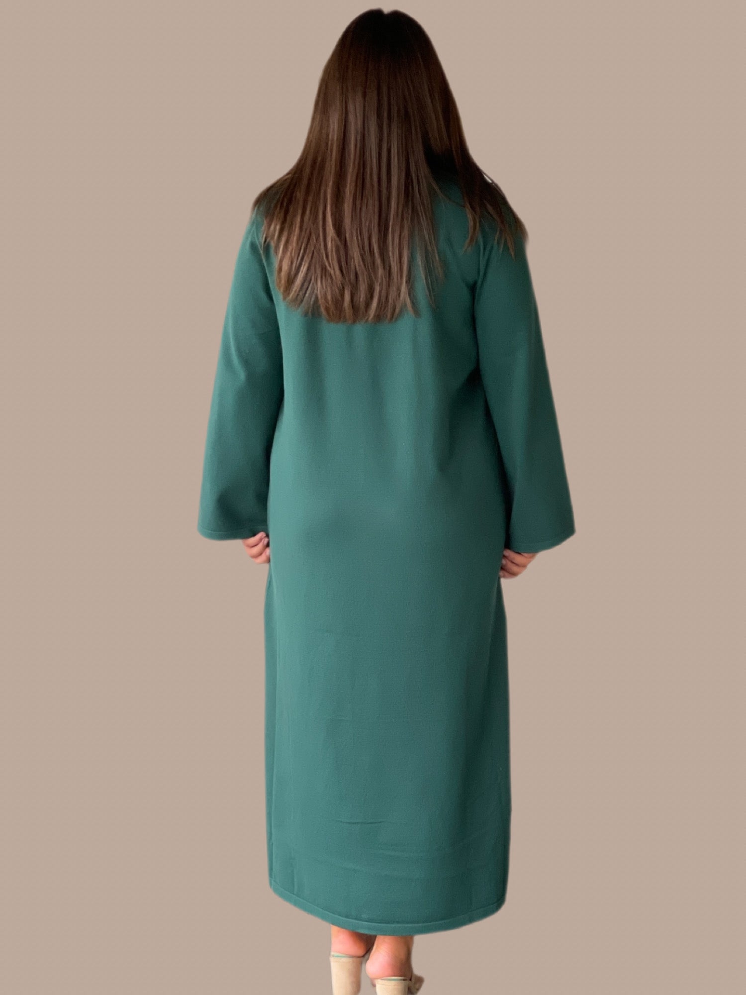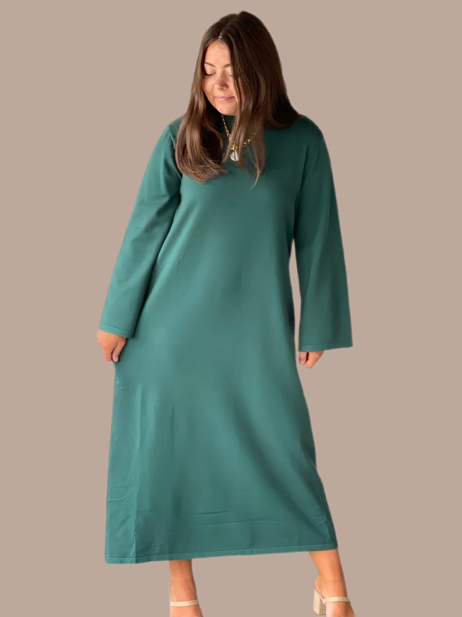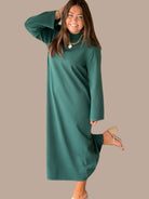 This solid mock neck midi dress features long sleeves and a medium-weight knit fabric that offers comfortable coverage without sheerness. Its unlined design ensures a sleek silhouette, making it ideal for layering or wearing on its own in cooler seasons. The refined construction and purposeful fit provide a polished, versatile piece suitable for both professional and casual settings.