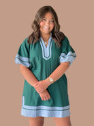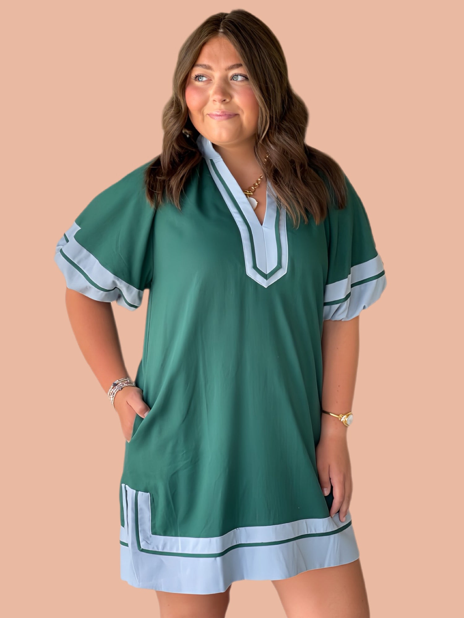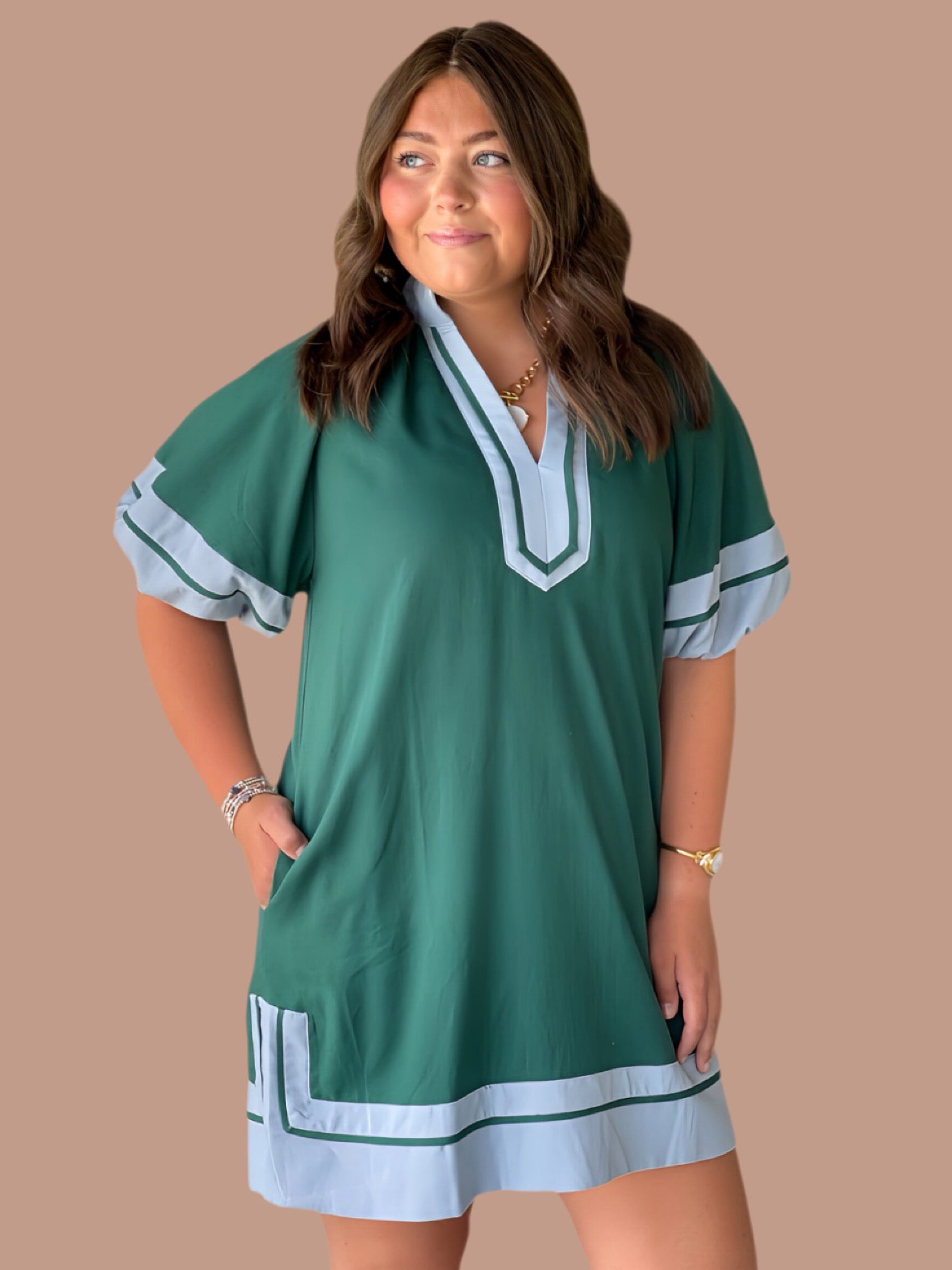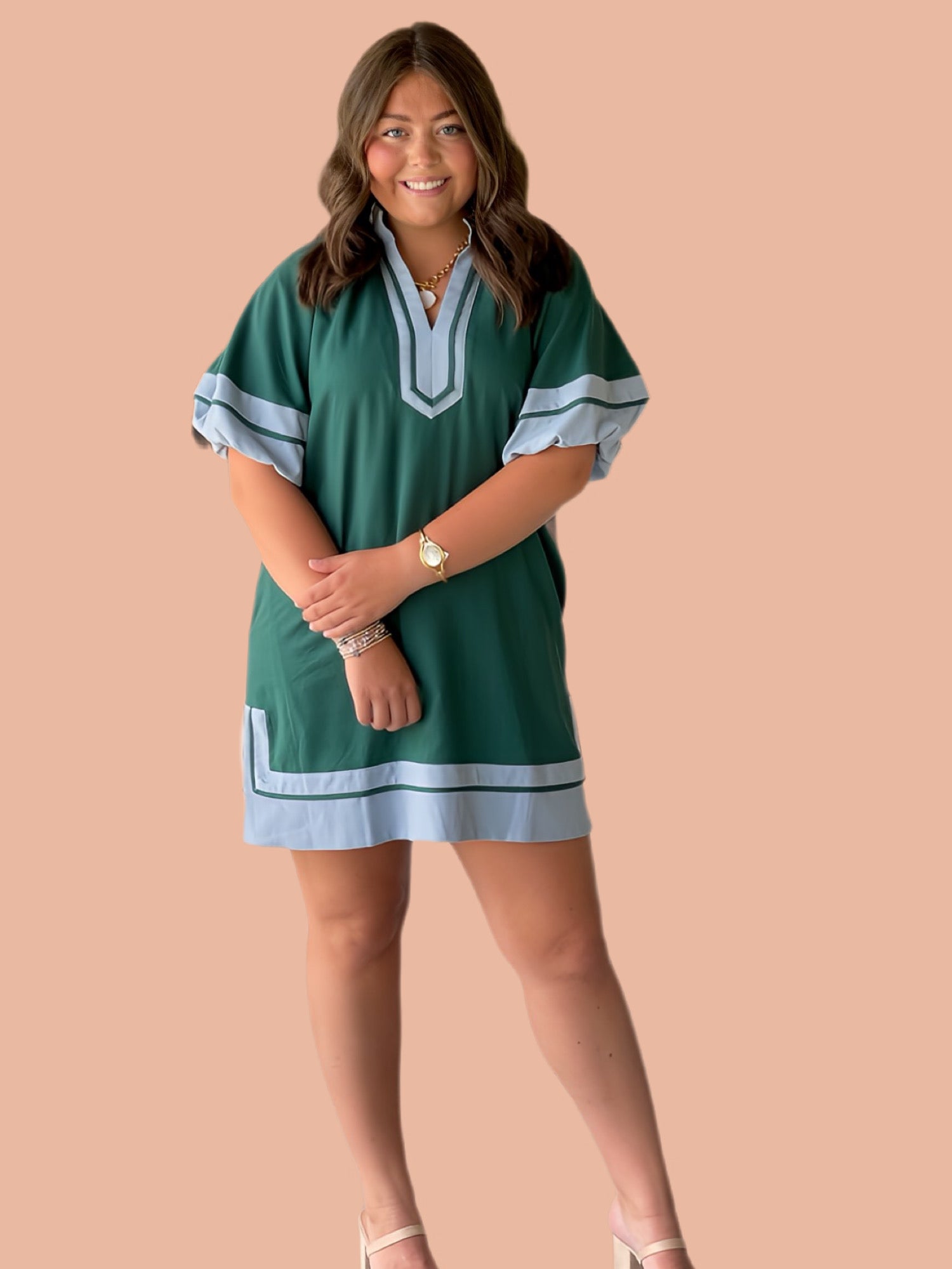 This expertly crafted mini dress features solid contrast accents and short lantern sleeves, offering a refined silhouette. The high neck split collar band adds a sophisticated touch, while the slit hem enhances movement and style. Made from a midweight woven fabric, it is fully lined and non-sheer, ensuring comfort and quality wear. Ideal for occasions requiring polished yet contemporary attire.
