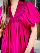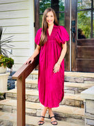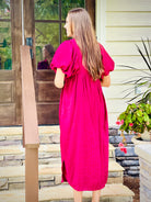 This beautiful midi dress features a textured design, short puff sleeves, and a v-neck collar for a stylish and sophisticated look. With a split at the hem and a lightweight, non-sheer woven fabric, this dress is comfortable and perfect for any occasion. Stay cool and stylish all day with its lined design.