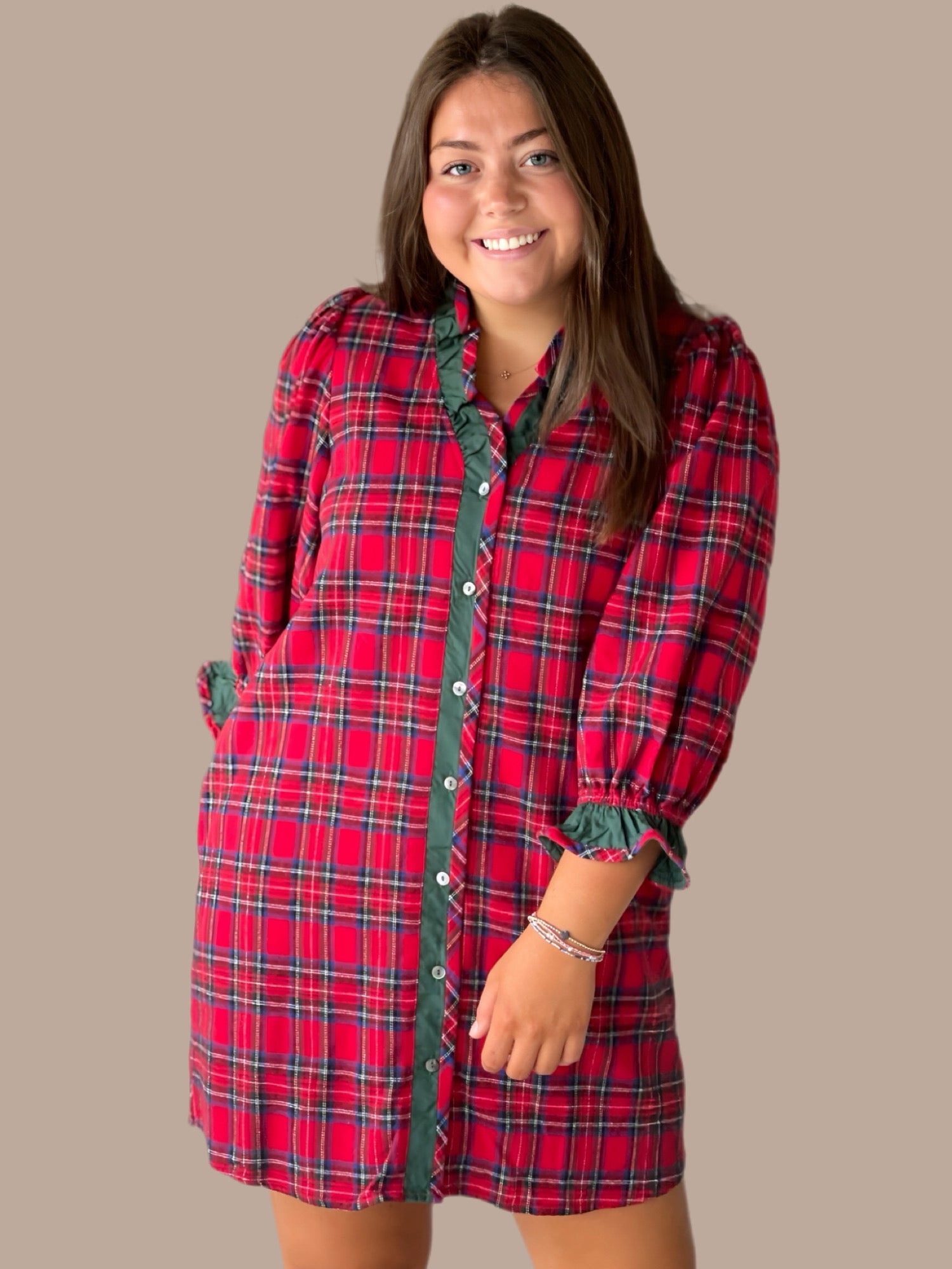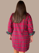 This plaid 3/4 puff sleeve mini dress combines classic patterning with modern detailing. Featuring contrast ruffled trim along the neck and front placket, it offers a refined aesthetic enhanced by a functional button closure. Side pockets add practicality without compromising style. Its woven, lightweight fabric is fully lined and non-sheer, ensuring comfort and coverage throughout wear. Ideal for those seeking a polished yet effortless look.
