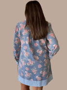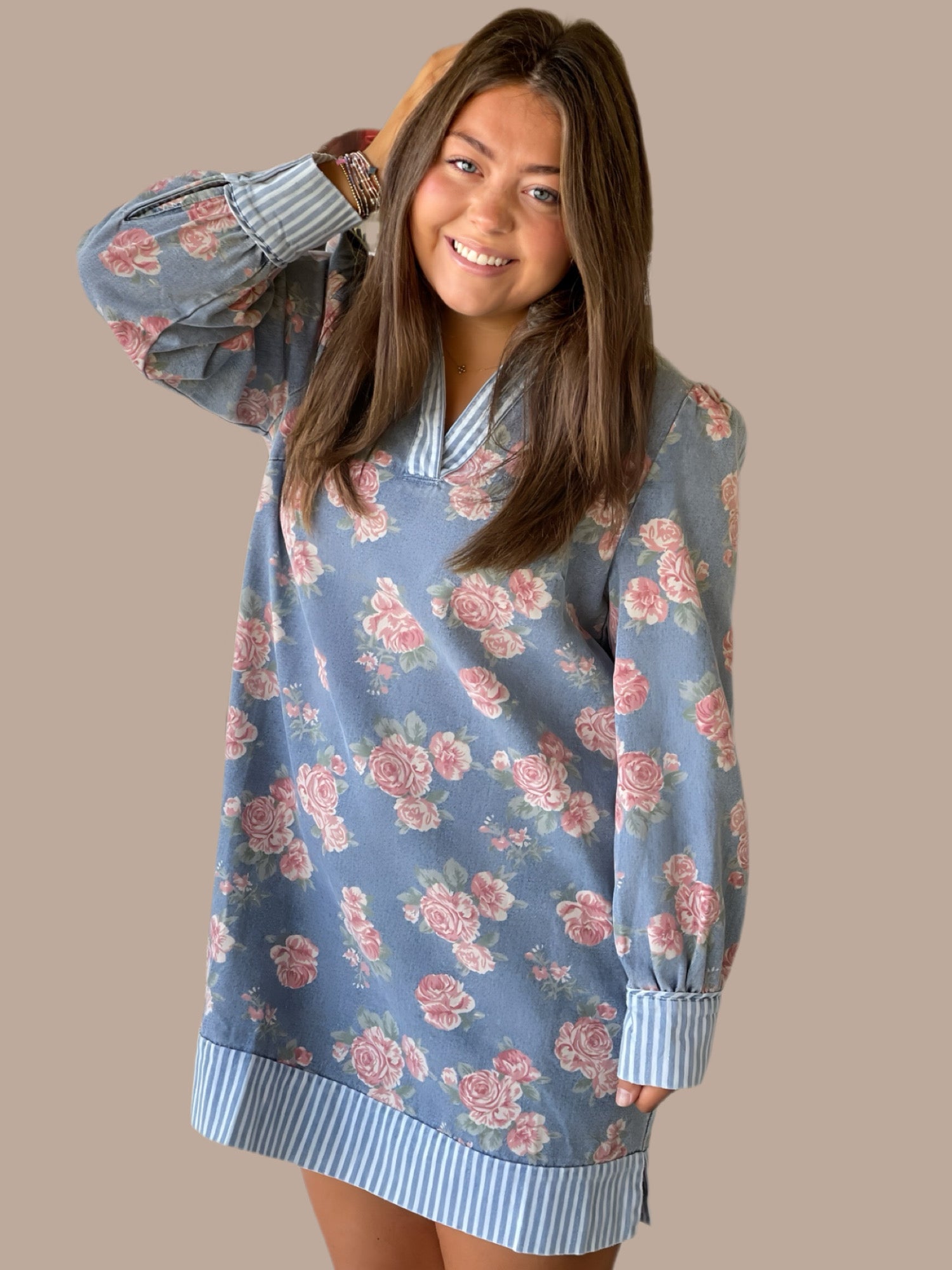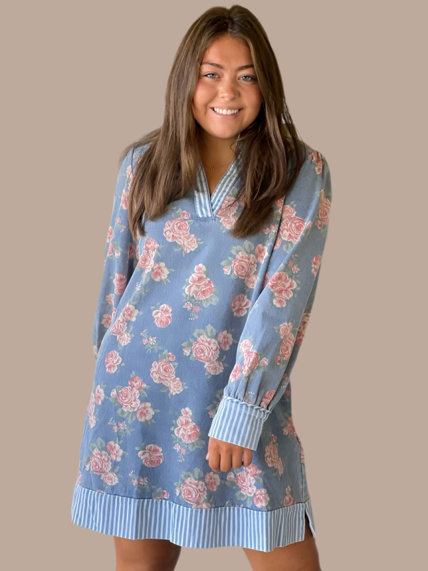 This long-sleeve floral denim dress seamlessly blends classic and contemporary styles. Featuring subtle stripe contrast details and a slightly slit hem, it offers a flattering silhouette with ease of movement. The ruffled neckline adds a touch of sophistication, while buttoned wrist cuffs provide a refined finish. Perfect for transitional seasons, this dress balances elegance with casual comfort, making it a versatile addition to any wardrobe.