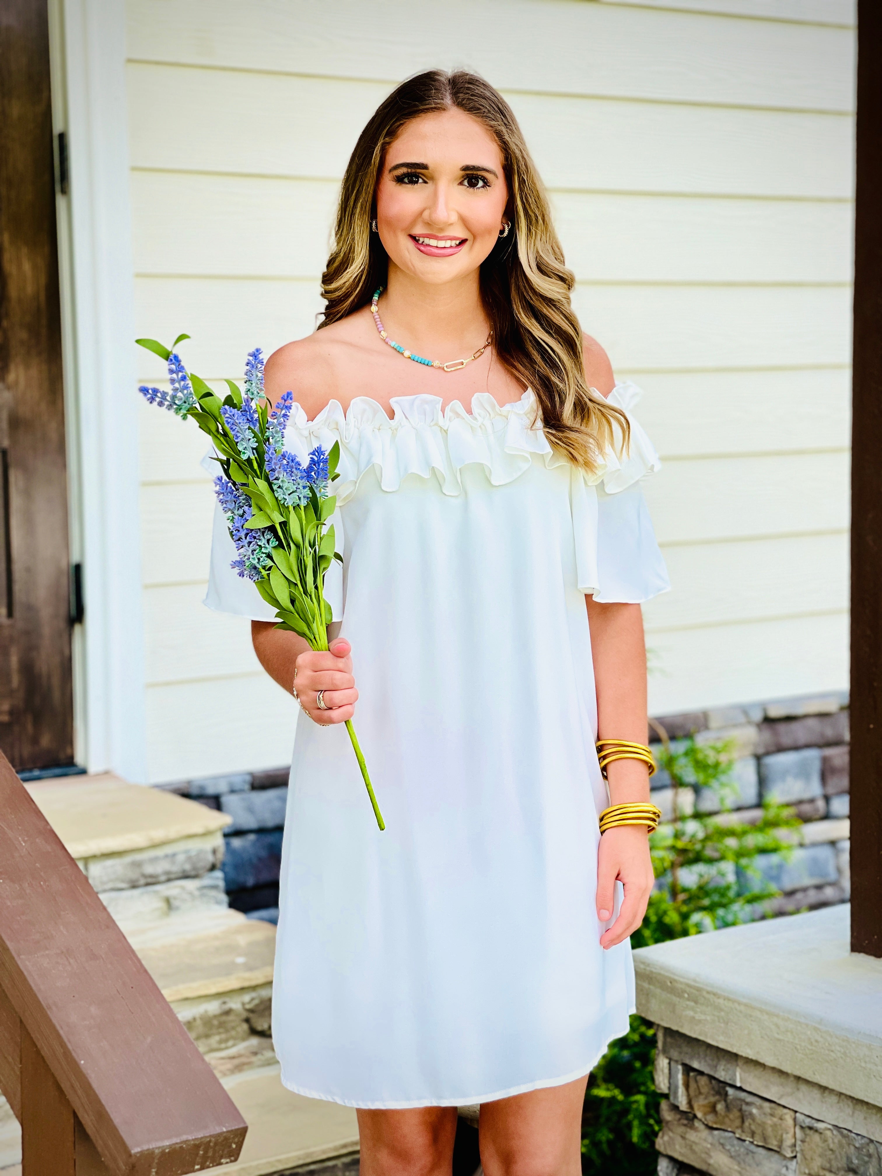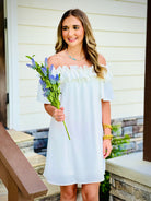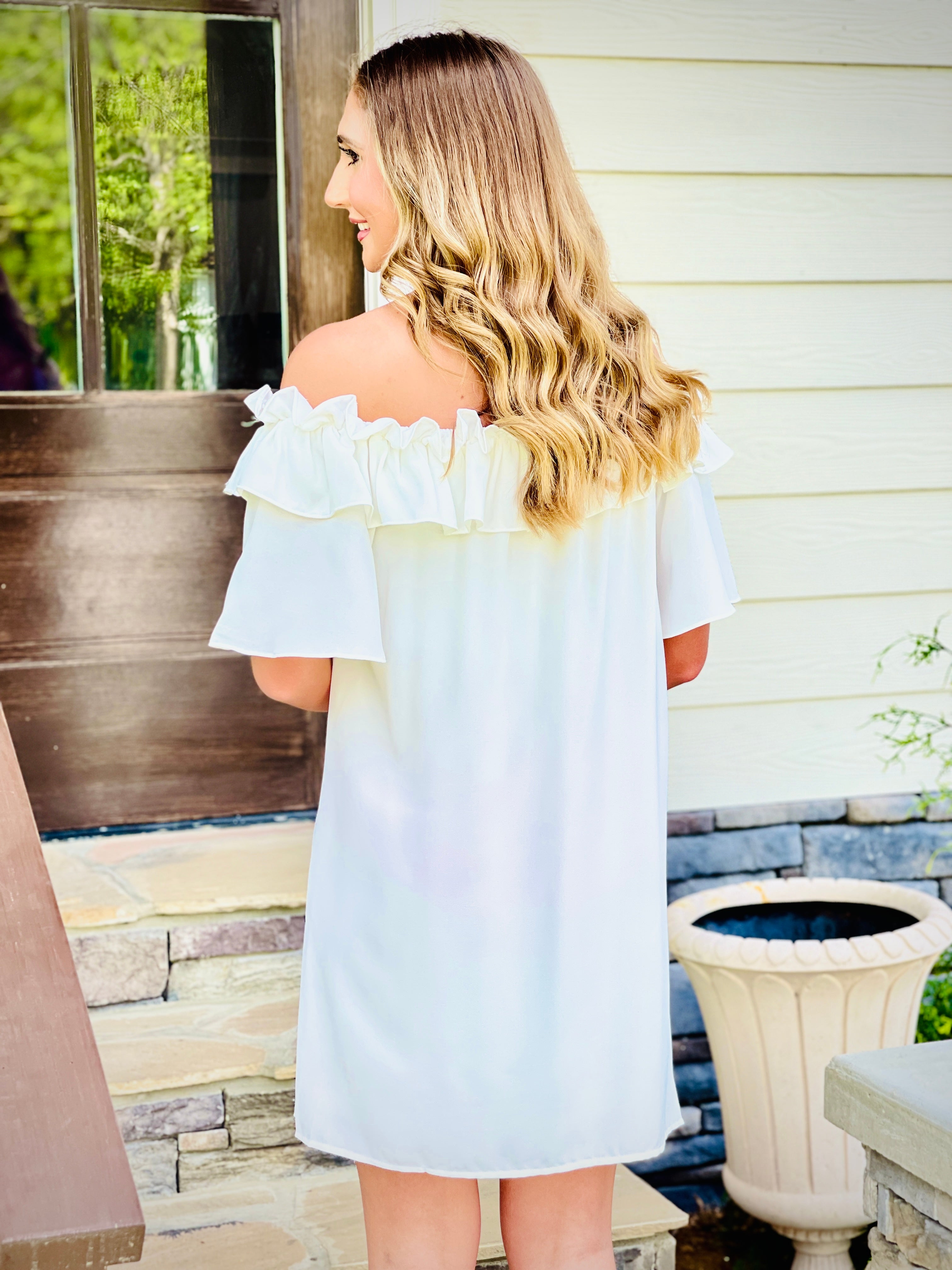 Expertly crafted from high-quality woven material, this dress features a stylish and feminine off-the-shoulder design with ruffled short sleeves. Perfect for any occasion, this dress effortlessly combines comfort and fashion. Elevate your wardrobe with this must-have piece.