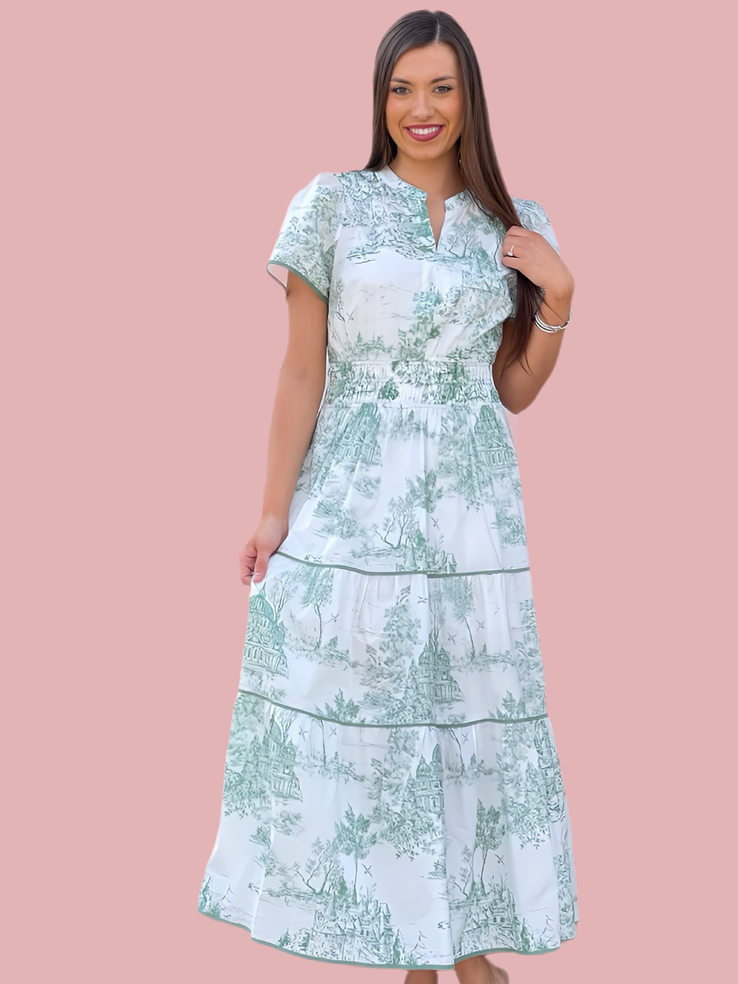 Upgrade your summer wardrobe with our Toile Print Tiered Maxi Dress. The split neck and smocked waist provide a flattering fit while the landscape print and contrast details add a touch of elegance. With balloon short sleeves, this dress is perfect for any occasion. Stay stylish and comfortable all day long.