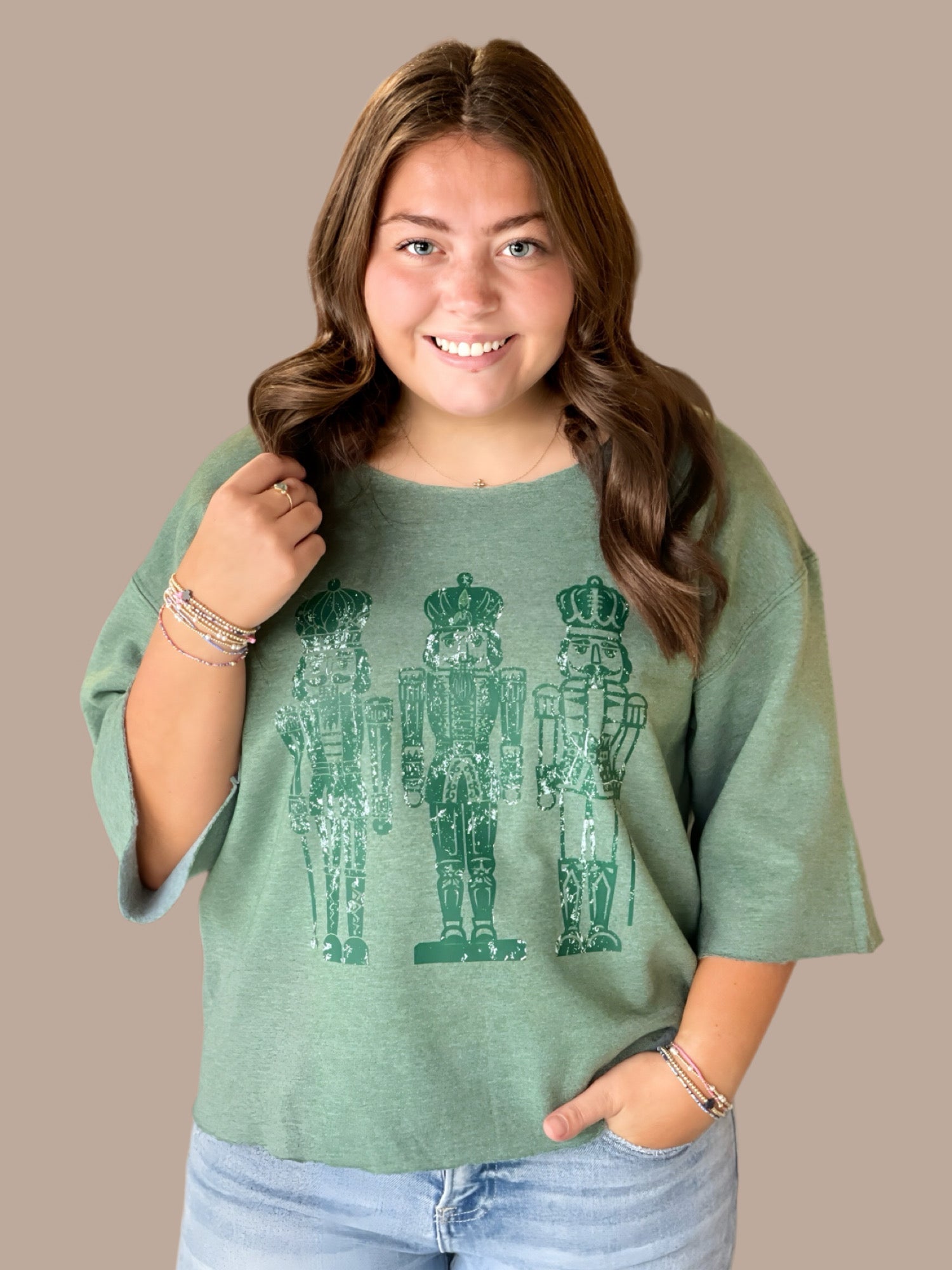 Introducing the Nutcracker Green Sweatshirt, featuring a vibrant green color and 3/4 length sleeves. Made from soft and comfortable material, this sweatshirt is perfect for a casual yet stylish look. Add a touch of festive charm to your wardrobe with this Nutcracker sweatshirt.
