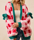 This open-front Christmas cardigan combines festive charm with sophisticated comfort. Featuring a ribbon detail that adds a delicate, holiday-inspired accent, it's perfect for layering over your favorite seasonal outfits. Crafted to provide warmth without bulk, this sweater cardigan is an elegant choice for holiday gatherings and casual winter wear alike.