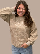 Elevate your casual wardrobe with this lace mocha sweatshirt, crafted from luxuriously soft fabric that feels like butter against your skin. The delicate lace detailing adds sophisticated texture and visual interest, while the rich mocha tone complements any seasonal palette. Perfect for layering or wearing solo, this piece transitions seamlessly from weekend errands to relaxed social gatherings. The premium softness ensures all-day comfort without compromising on style, making it an essential addition to your everyday collection.