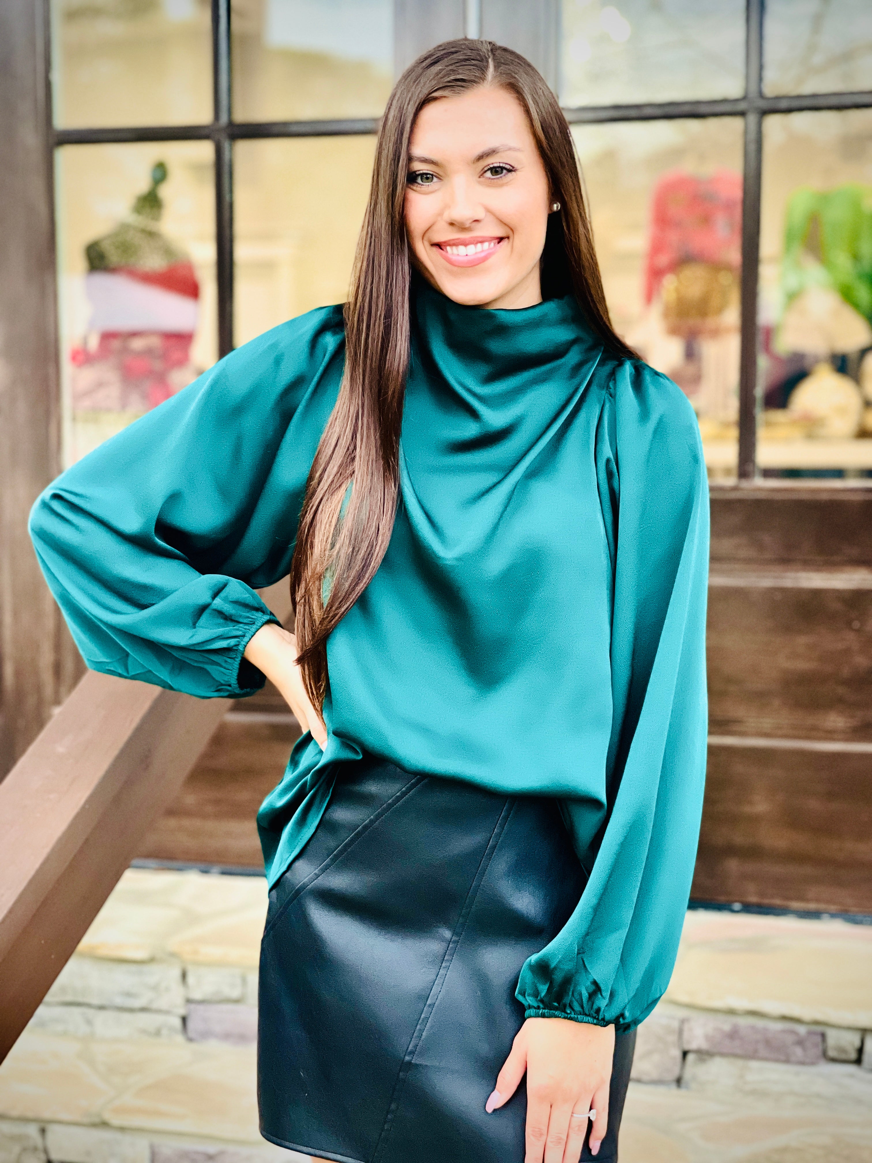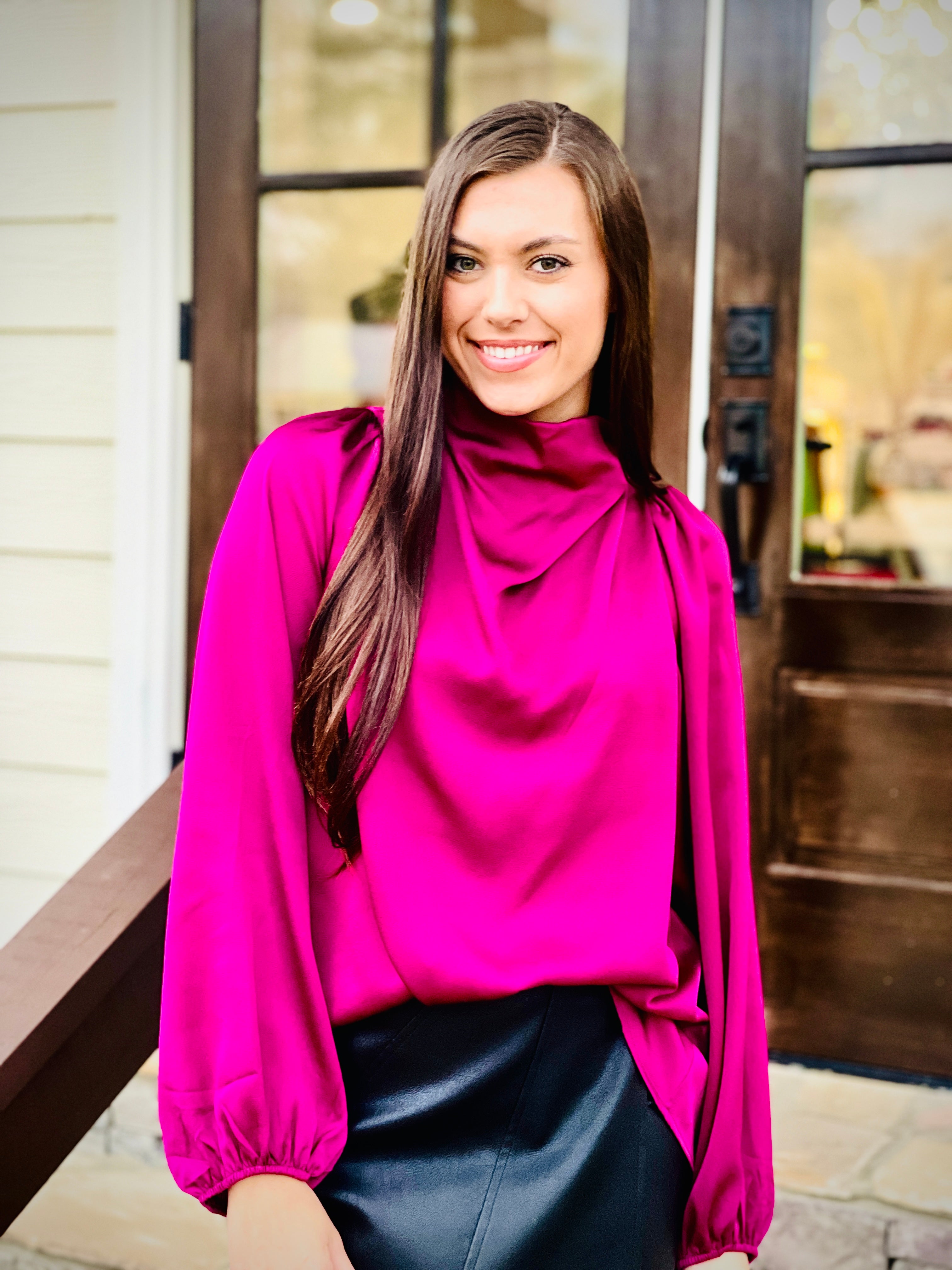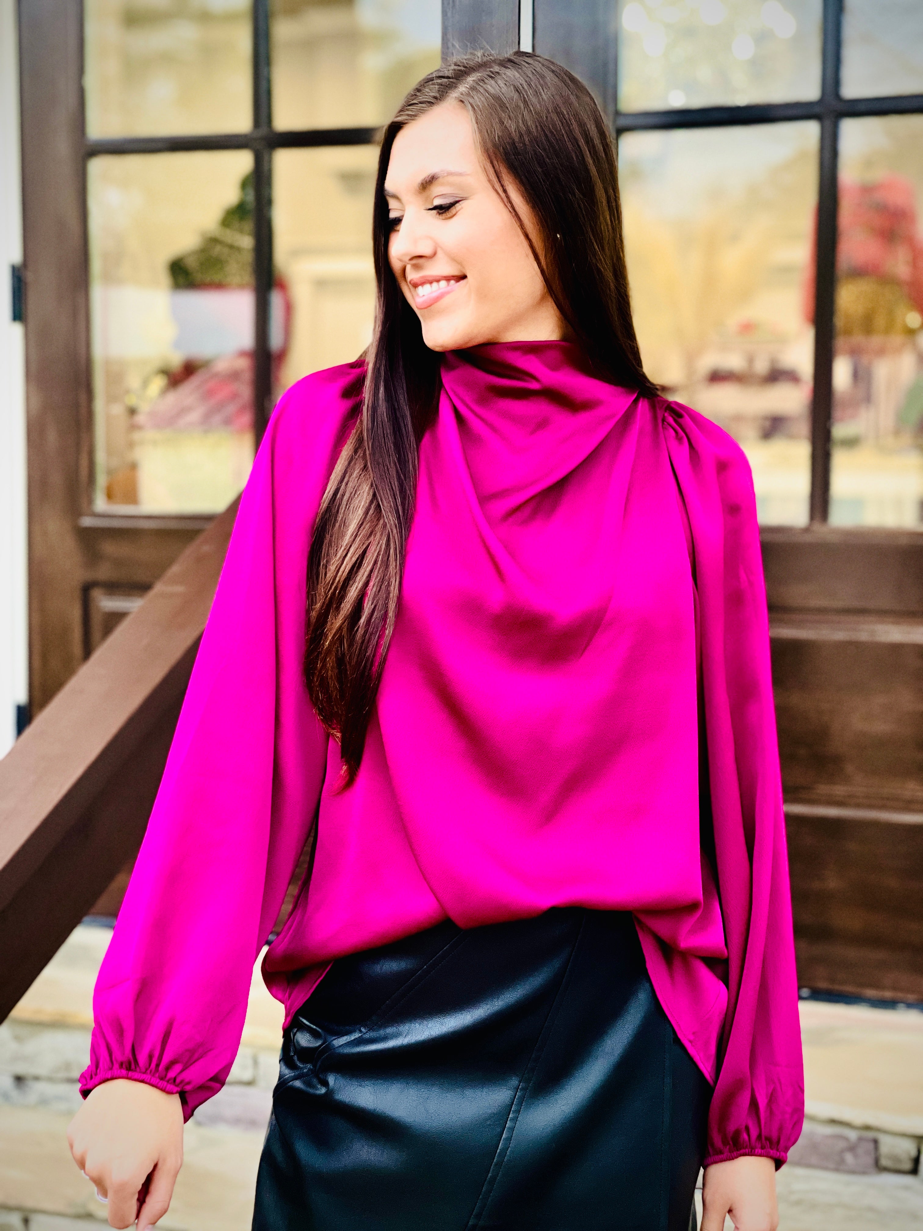 This long sleeve satin top is the perfect addition to your wardrobe. Featuring a flowy and lightweight fabric, a drape neck, and a keyhole button closure at the back for an elegant finish. Wear this top for any occasion, from a dressy formal event to a casual dinner out.