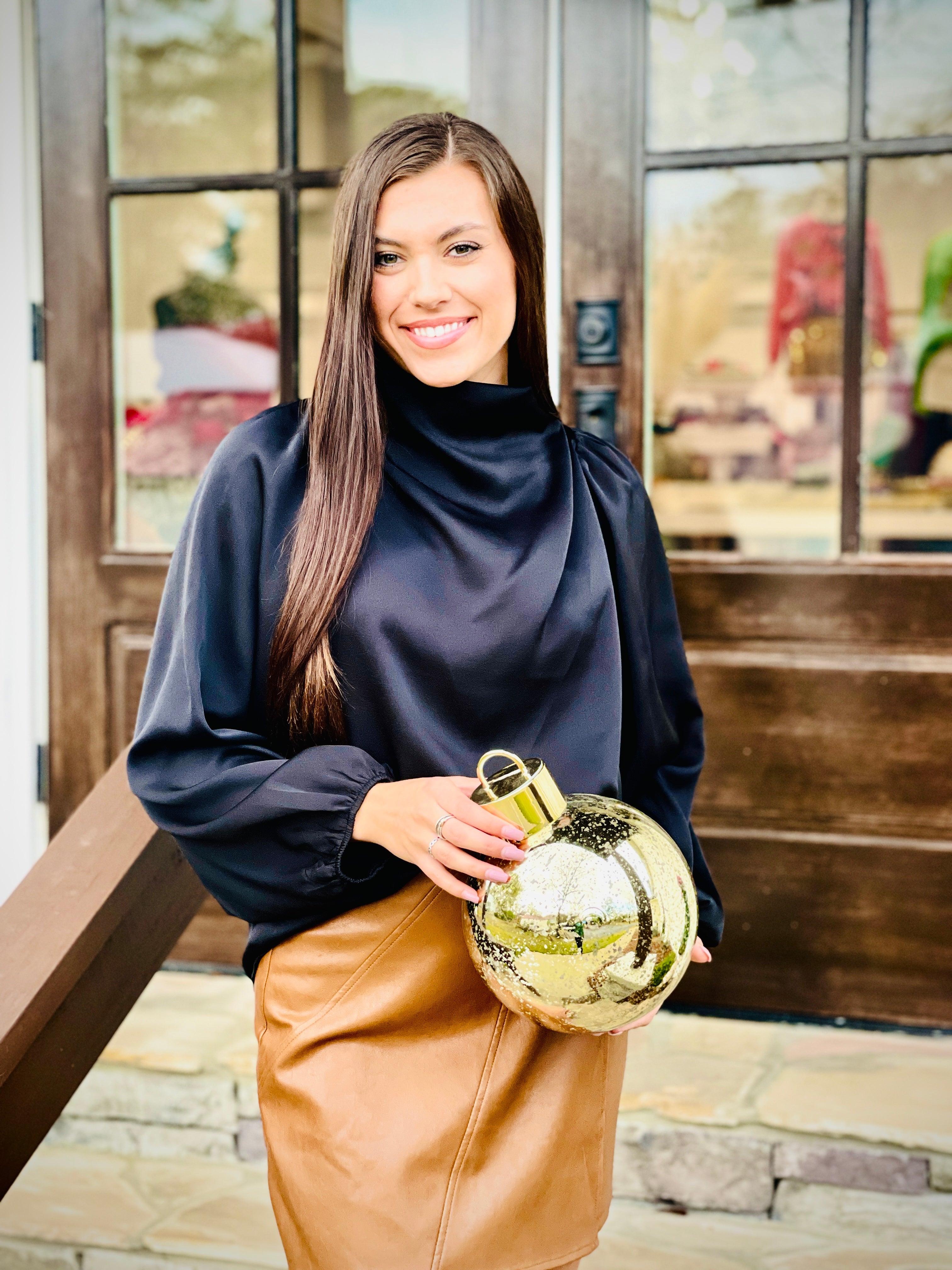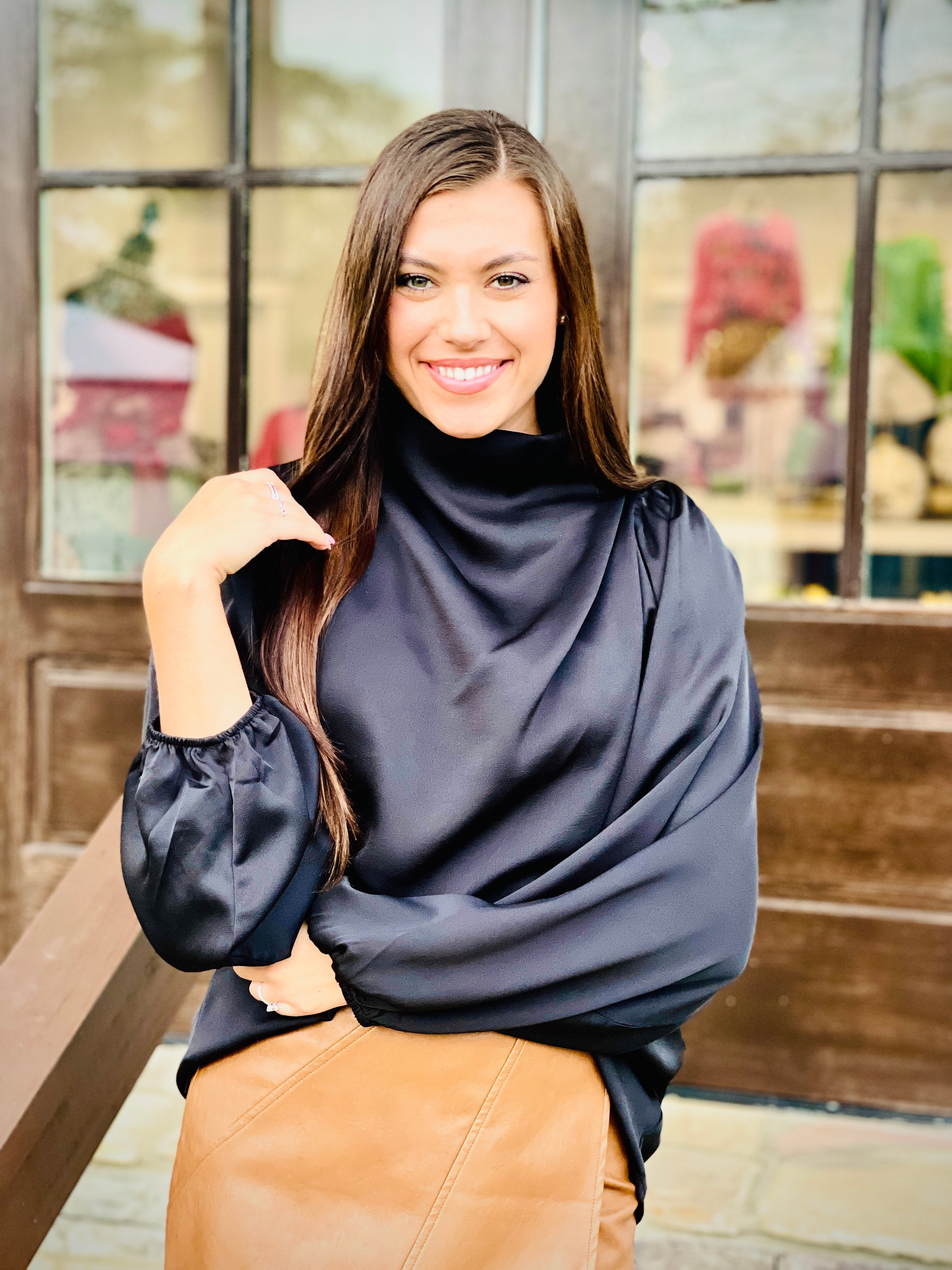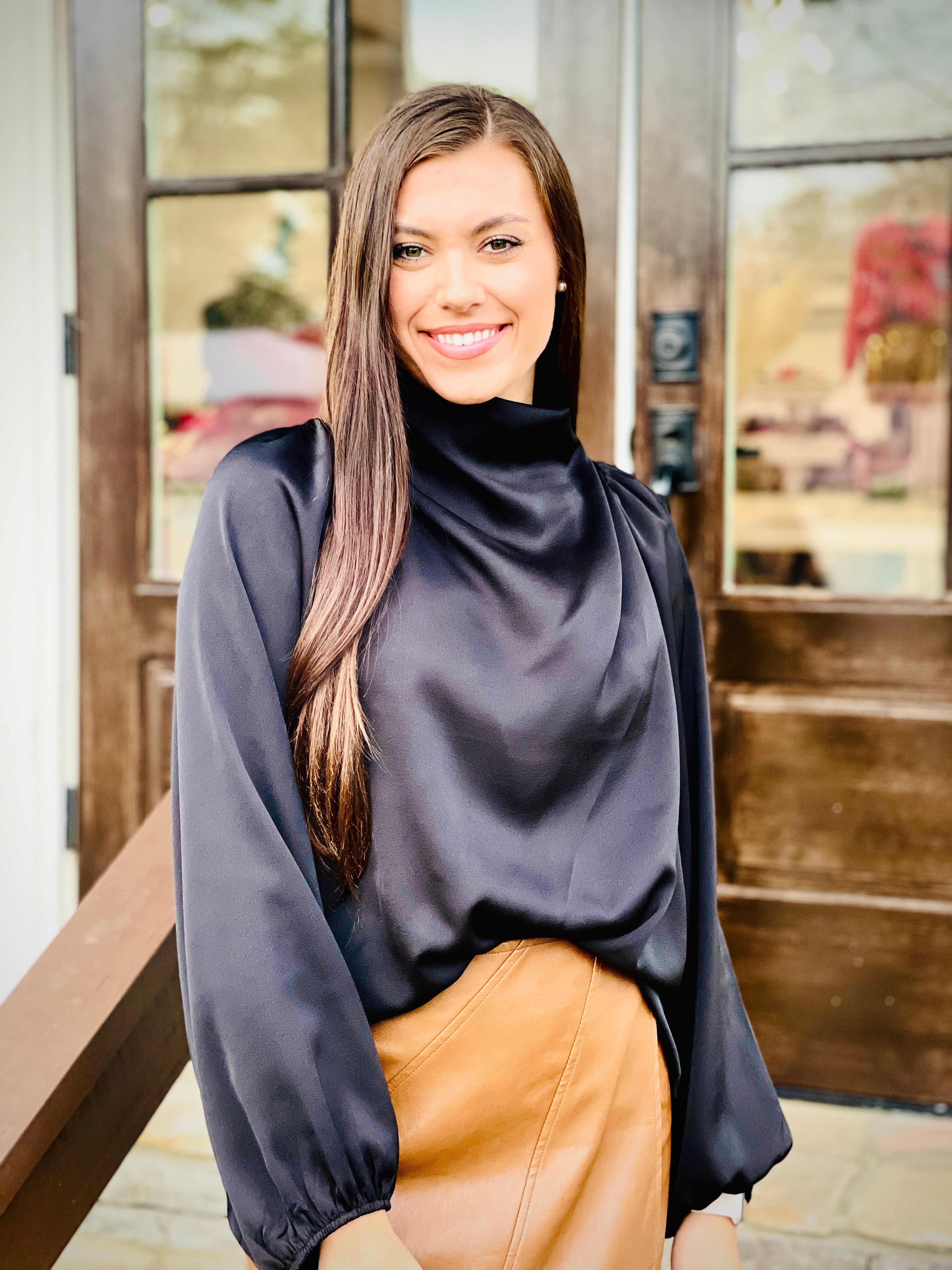 This long sleeve satin top is the perfect addition to your wardrobe. Featuring a flowy and lightweight fabric, a drape neck, and a keyhole button closure at the back for an elegant finish. Wear this top for any occasion, from a dressy formal event to a casual dinner out.