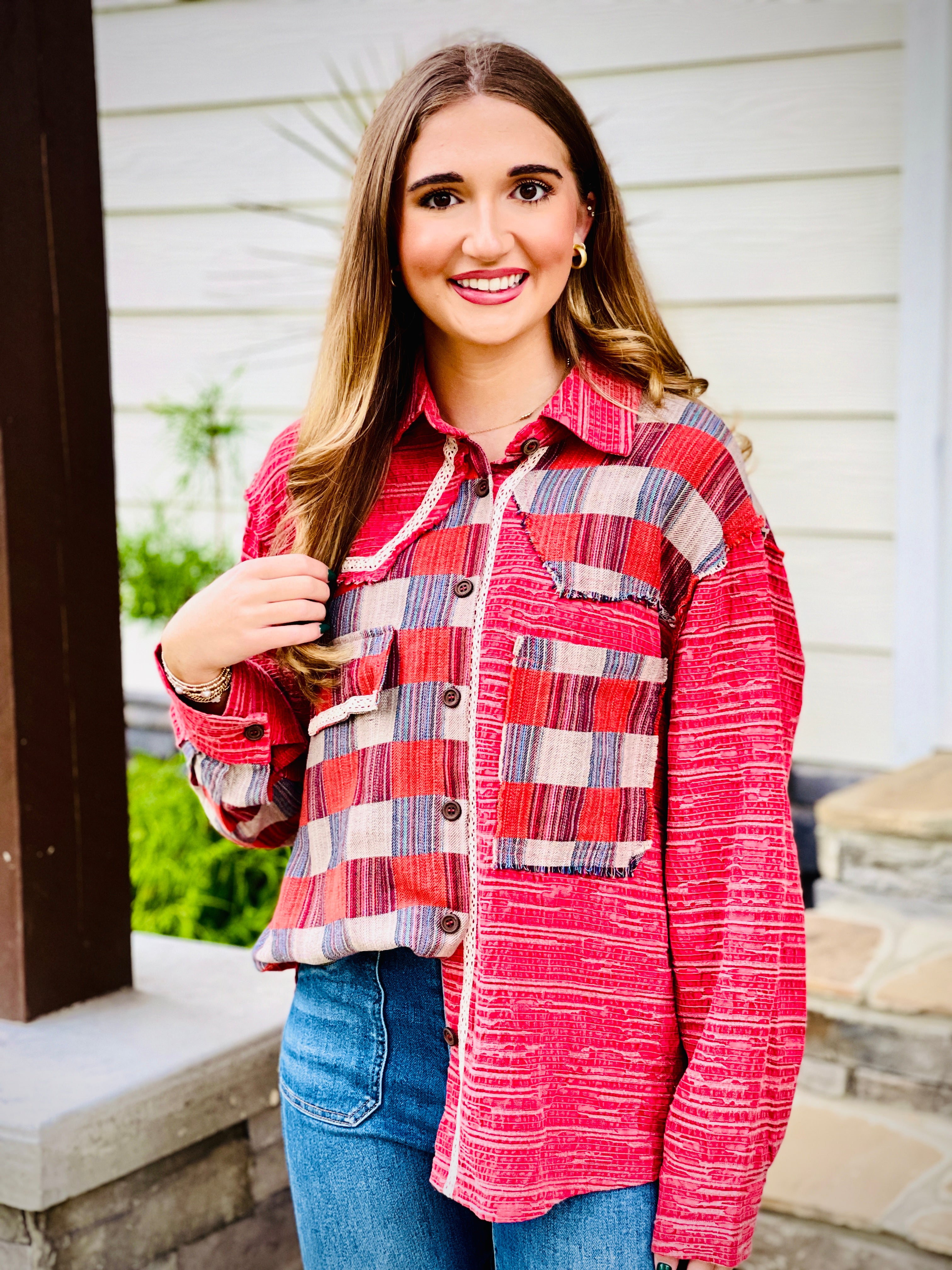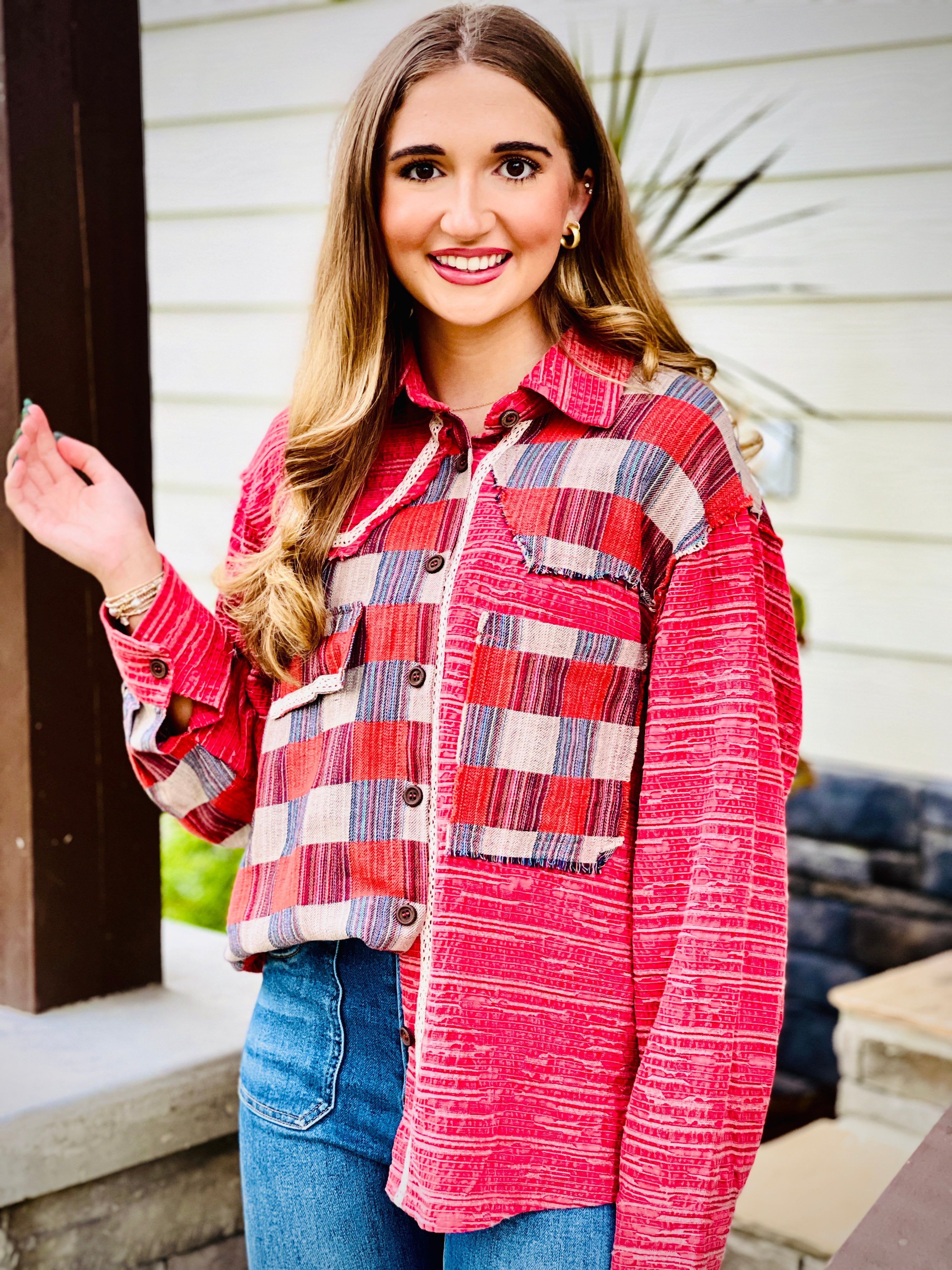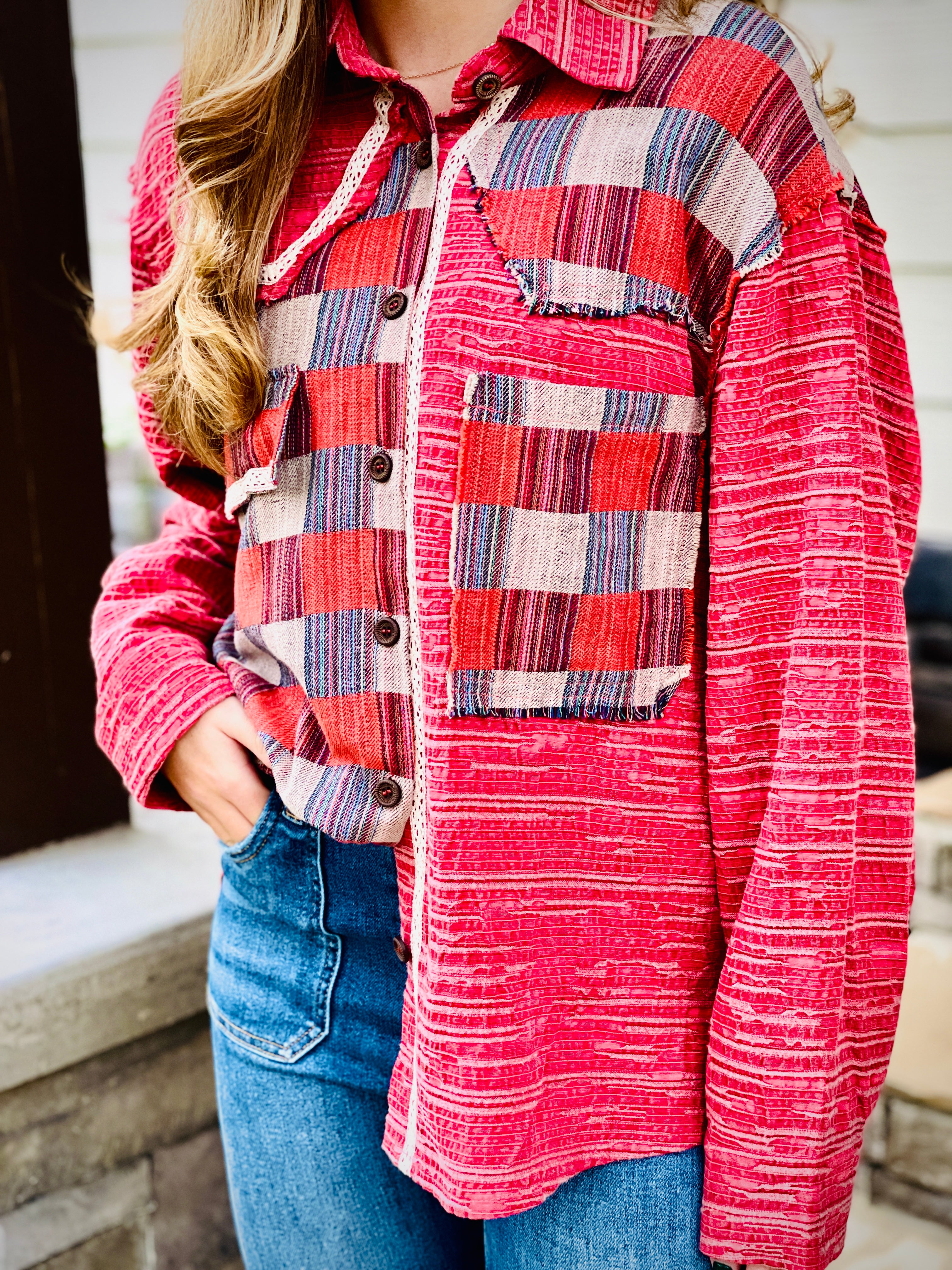 This long sleeve top is designed with a roomy fit and made from textured woven fabric, with a stylish plaid contrast. Perfect for adding a touch of comfort and sophistication to your wardrobe.