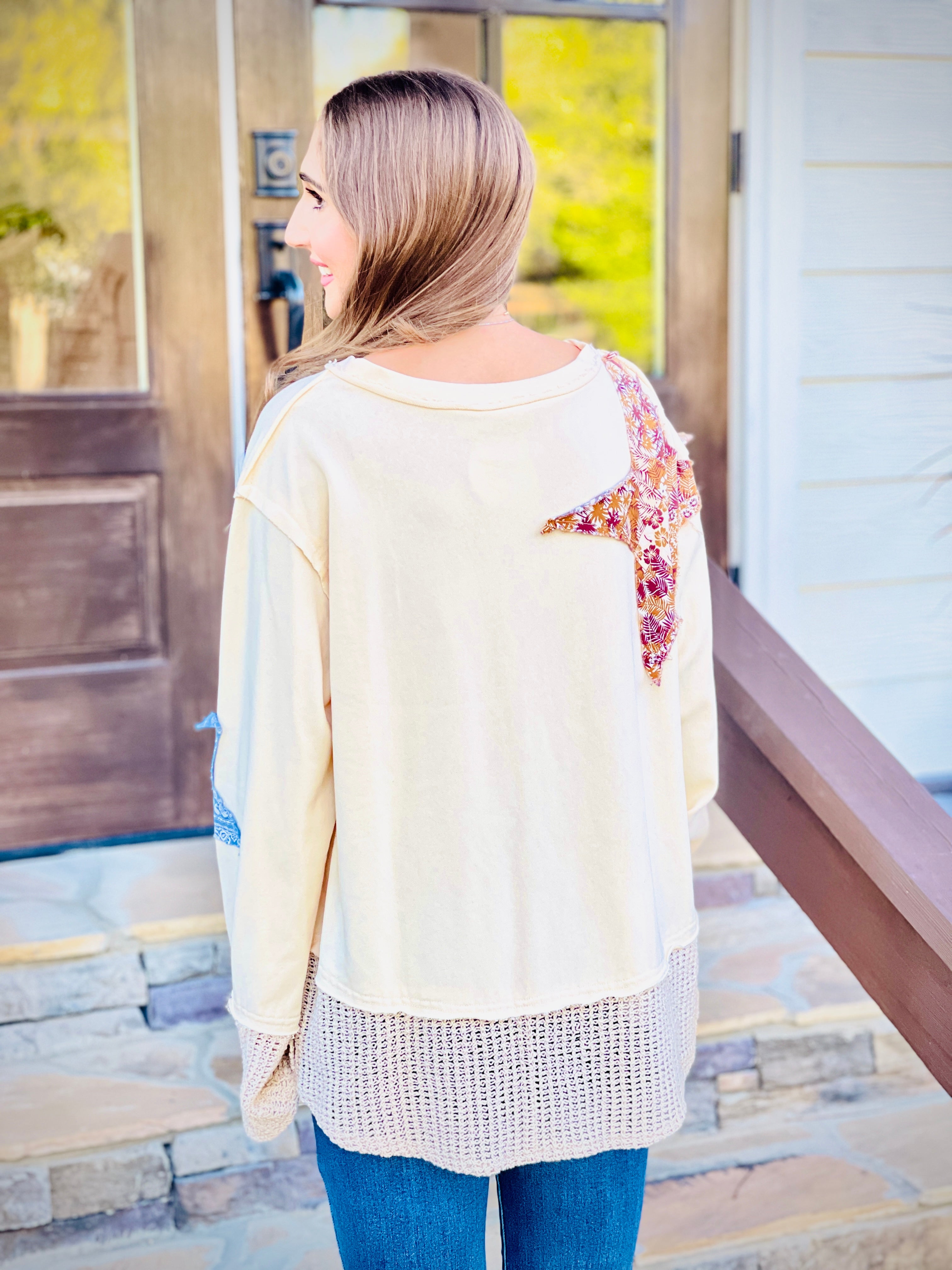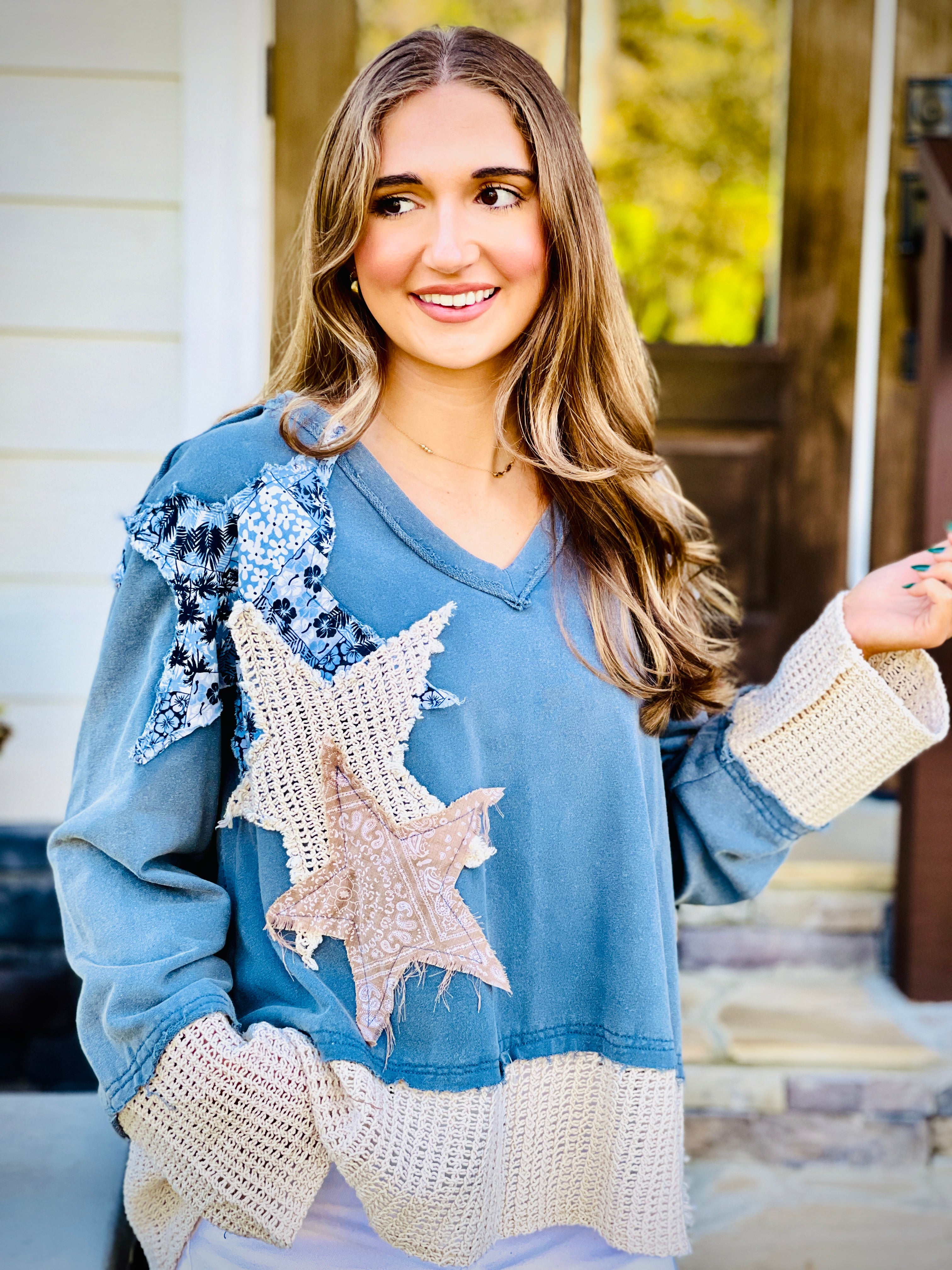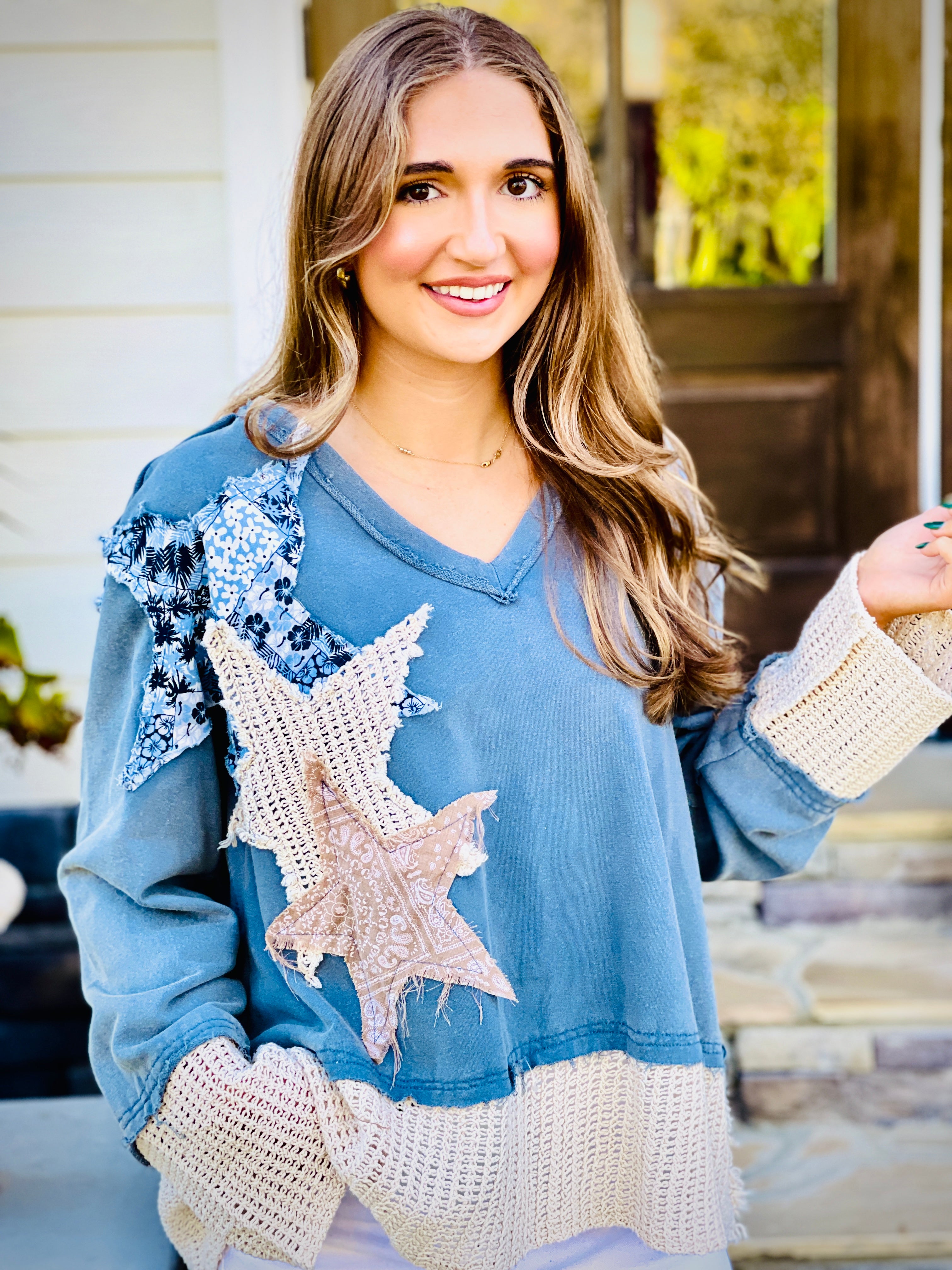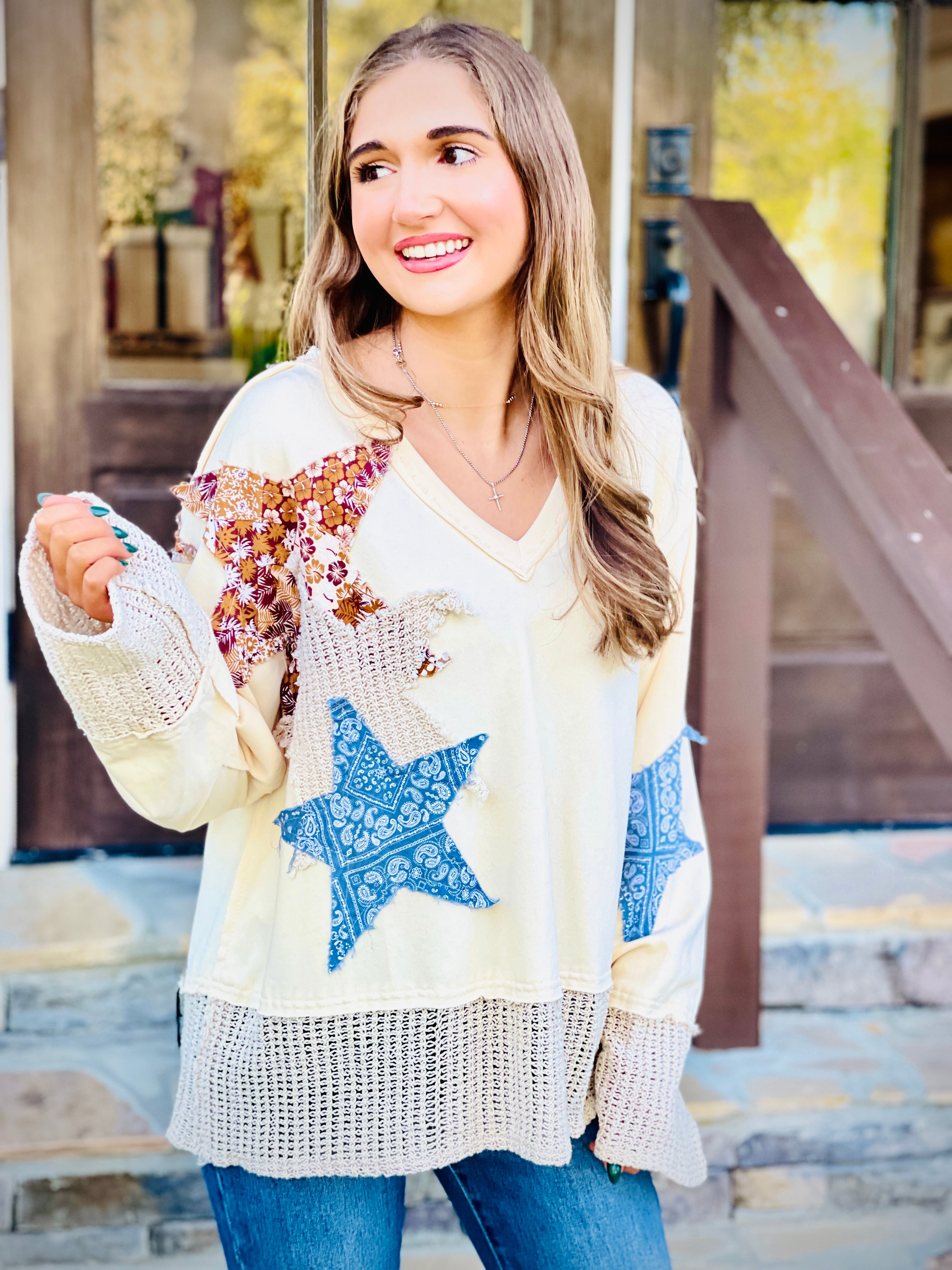 This V neck long sleeve top is designed for a roomy fit and made with French terry fabric. The star patch detail adds a touch of style. Made for comfort and fashion, this top is perfect for any occasion.