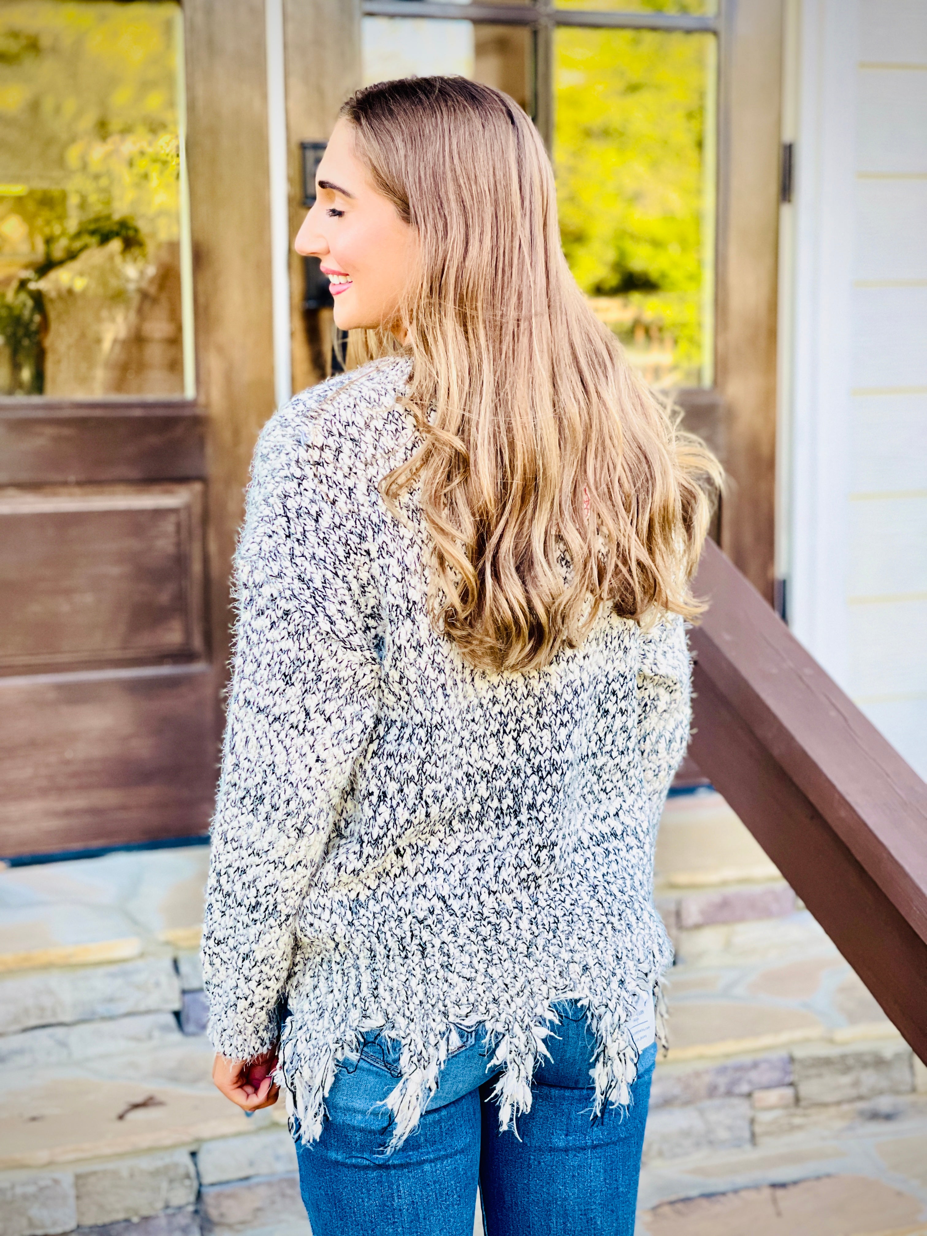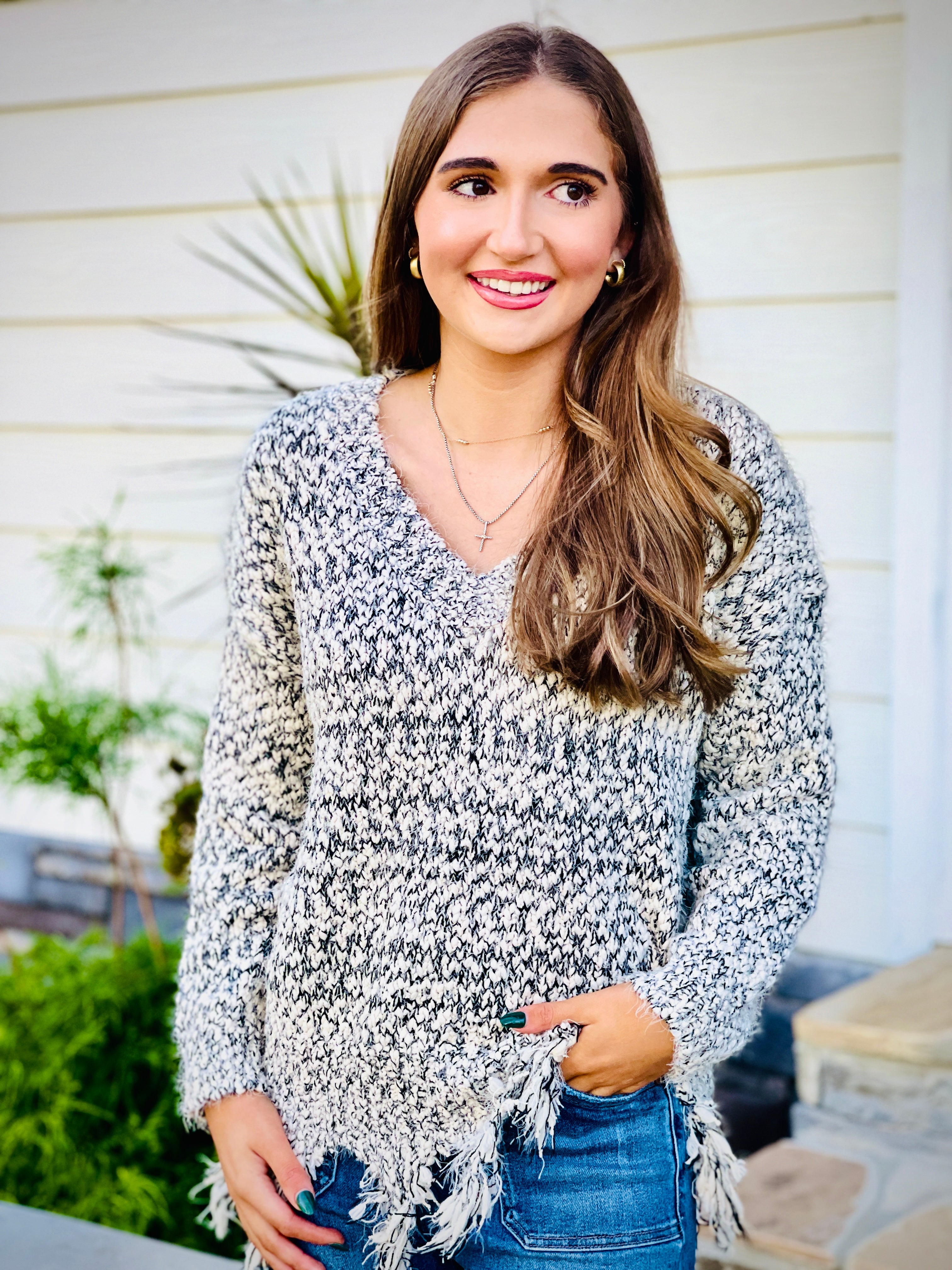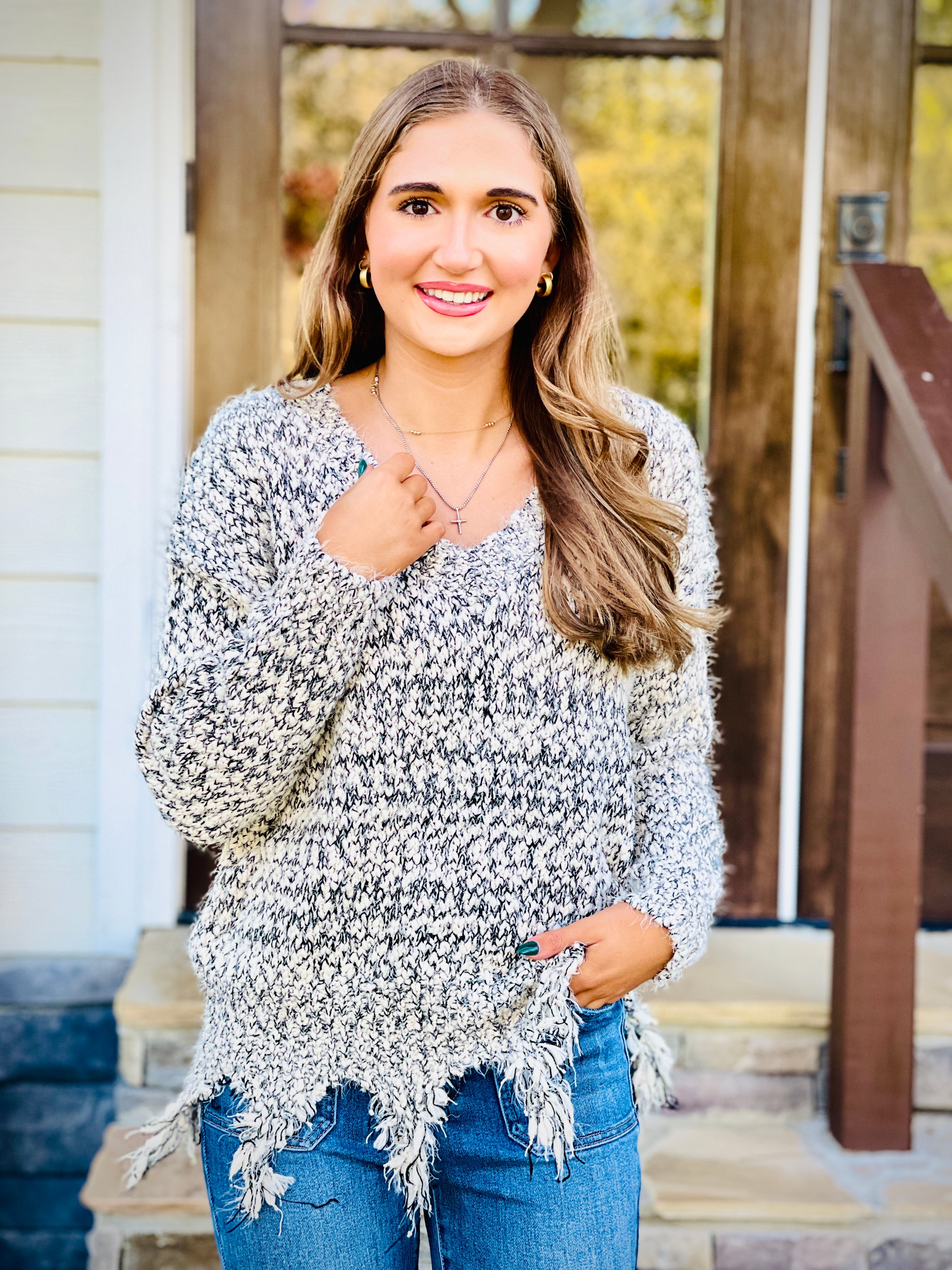 Update your wardrobe with our V-Neck Long Sleeve Knit Pullover Sweater. Made from soft knit fabric, this sweater features a modern V-neck design and flattering long sleeves. The frayed hem adds a touch of edge and sophistication. Perfect for a casual day out or a cozy night in.
