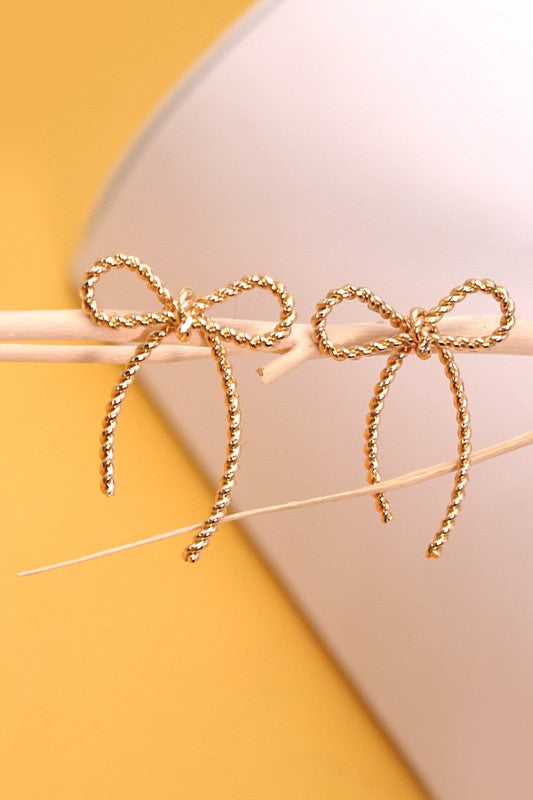 These modern, edgy bow design rope twist post earrings measure 0.75" in length and 1" in width, offering a stylish accent to any outfit. Their unique twisted rope detail adds texture and sophistication, making them a favored choice for pairing with rompers or dresses. The secure post backing ensures comfortable, all-day wear. Perfect for elevating your look with a subtle yet distinctive touch.