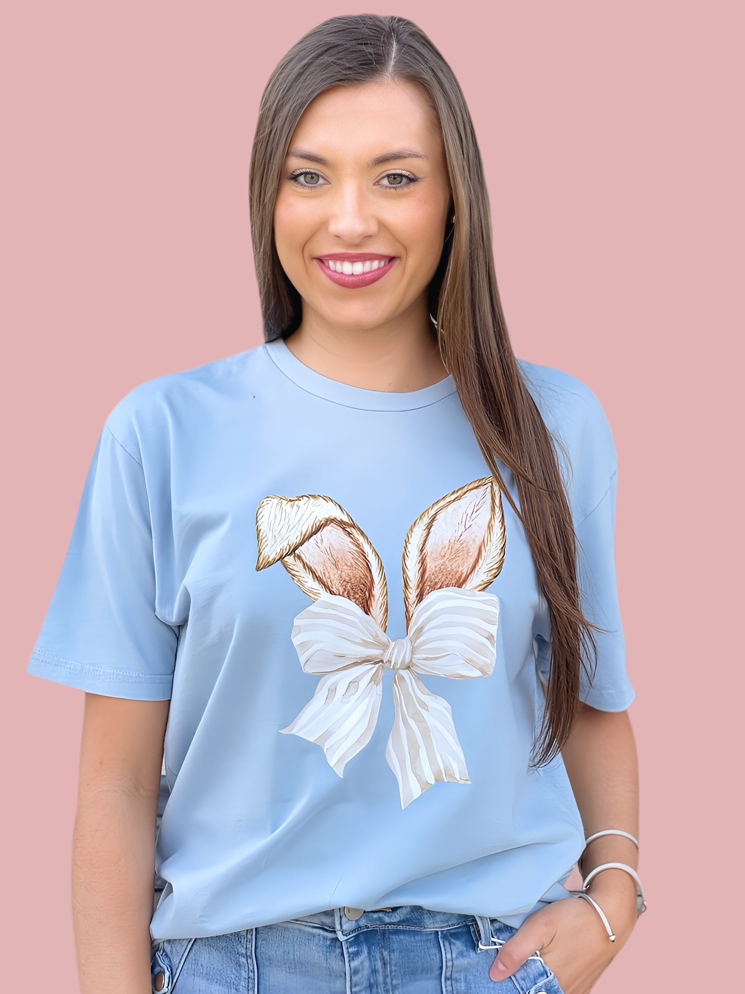 The Bunny bow t-shirt is a must-have for any fashion-forward individual. With its adorable bunny print and feminine bow detail, this t-shirt is the perfect combination of cute and chic. Made from high-quality fabric, it offers both style and comfort. Elevate your wardrobe with this trendy piece.