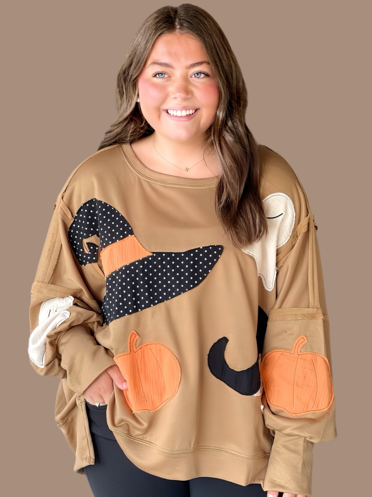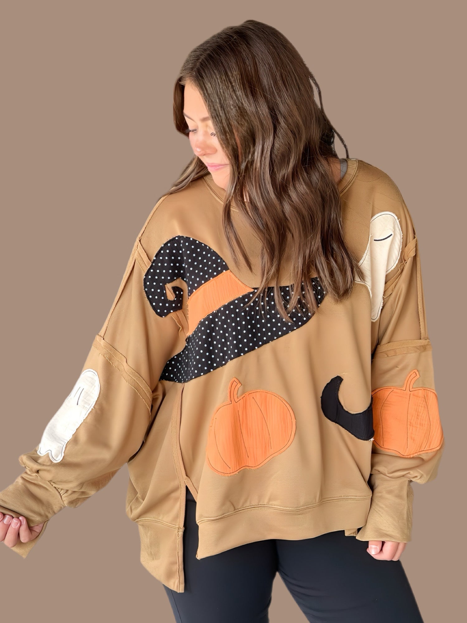 Embrace cozy autumn style with this oversized French terry sweatshirt featuring a unique Halloween-themed patchwork design. Crafted for comfort and warmth, its cut edge detailing adds a modern, relaxed touch while enhancing breathability. Perfect for layering, this sweatshirt balances festive flair with everyday wearability, making it an expert choice for seasonal wardrobes seeking both comfort and distinctive style.