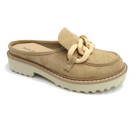 The Pierre Dumas Mora is a must-have for any fashion-forward individual. With its taupe color and vintage look, this slip-on shoe features a unique chain link detail on the front and a platform heel. The suede fabric and stitched sole add a touch of class to this cute and playful shoe.