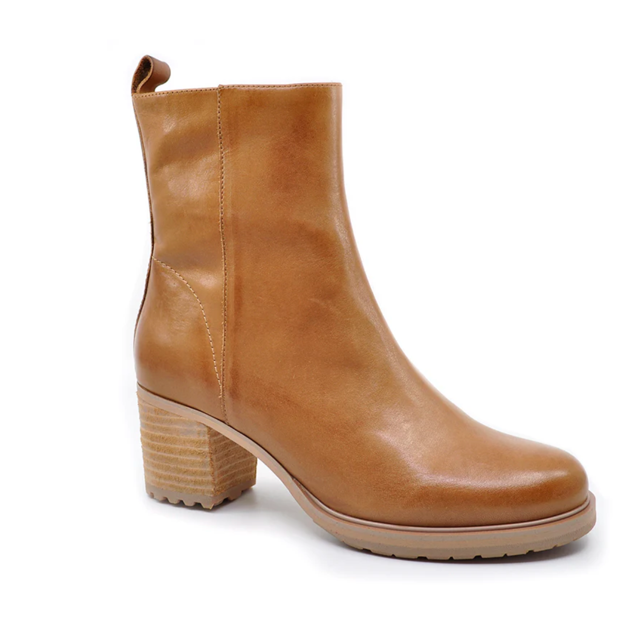 As a footwear expert, I present you with our Mid Height Boot. Refined leather upper and lining create a luxurious feel. The 2 1/4" heel and 1/2" platform offer a comfortable lift, while the 7" shaft length and side zipper provide easy on and off. Padded insole and leather/rubber outsole ensure all-day support.