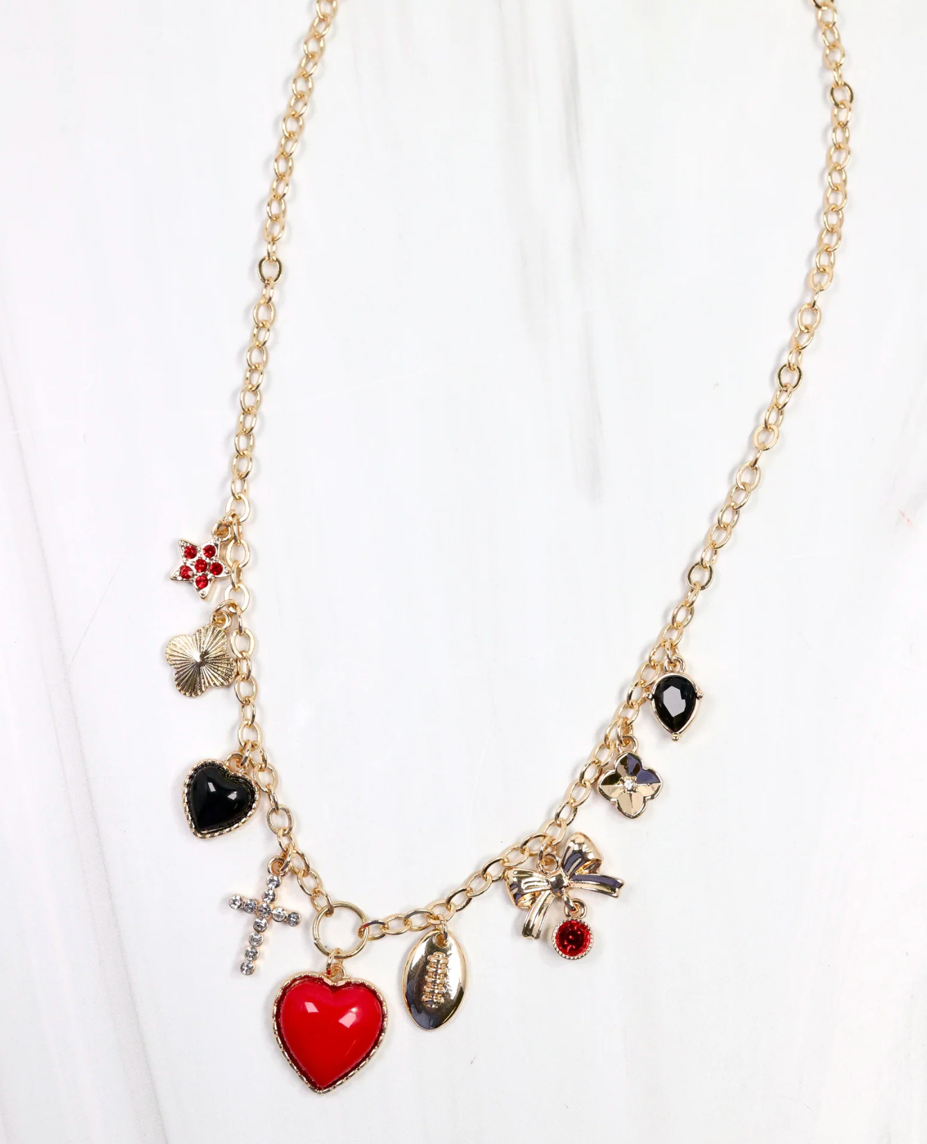 Celebrate game day in style with the Bentley Charm Necklace in red and black. This fashionable piece features two heart charms in your team colors, a football charm, and a variety of other playful accents. Perfect for showing your spirit with a chic touch, it’s a must-have accessory for every fan looking to combine passion and trend effortlessly.