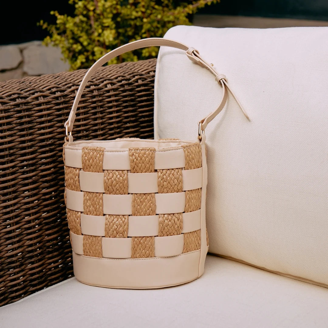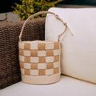 Raffia and vegan leather woven checkered bucket bag.