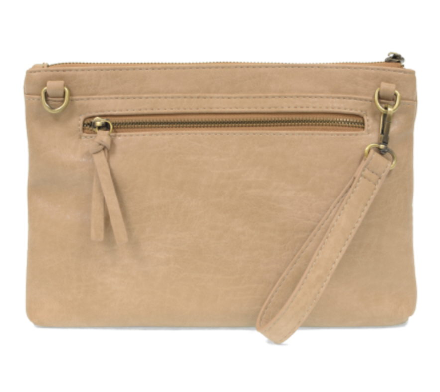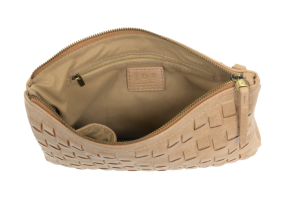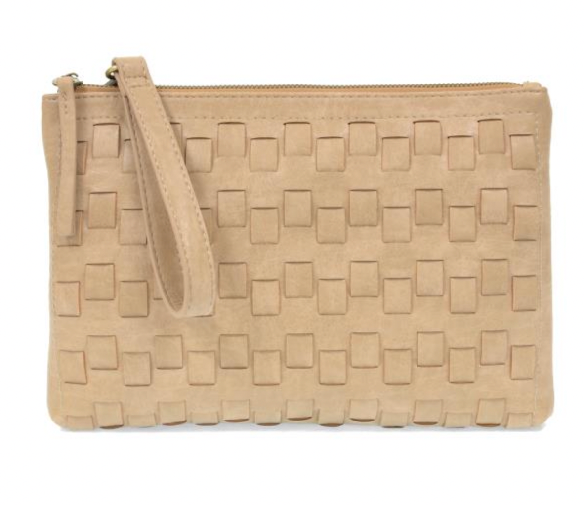SLEEK AND MINIMAL BUT WITH A HANDCRAFTED FEEL IN OUR CONTEMPORARY WOVEN BUFFALO GRAIN VEGAN LEATHER. THIS ENVELOPE STYLE CLUTCH IS SLIM YET ROOMY WITH A TOP ZIP CLOSURE, A REMOVABLE WRISTLET STRAP AND CROSSBODY SHOULDER STRAP WHEN YOU WANT TO BE HANDS FREE, ACCENTED WITH OUR SIGNATURE JOY ZIP PULL!