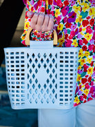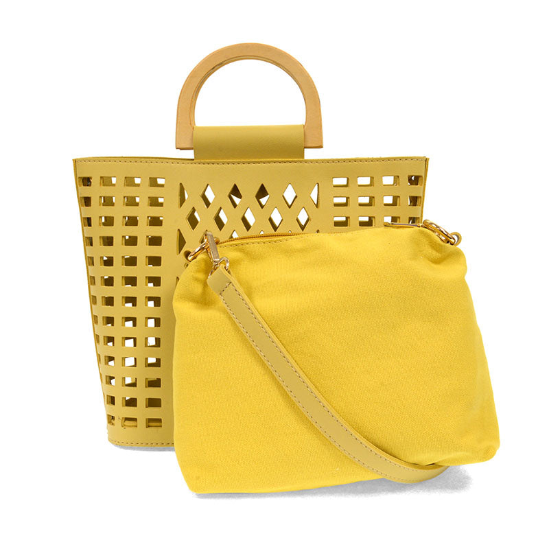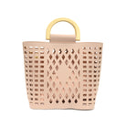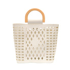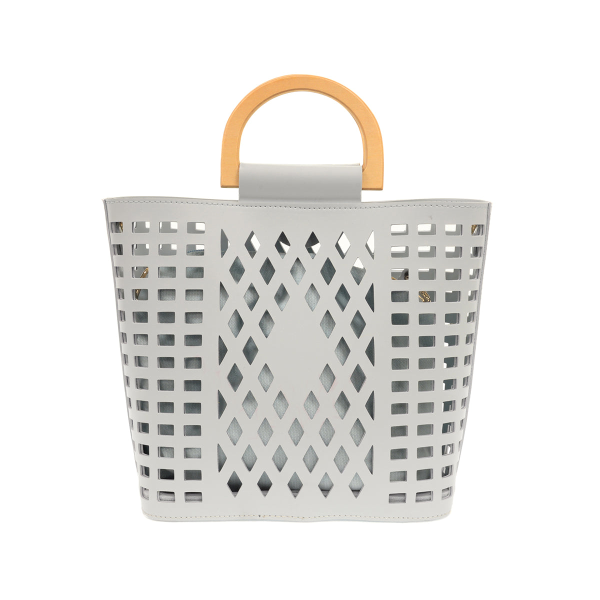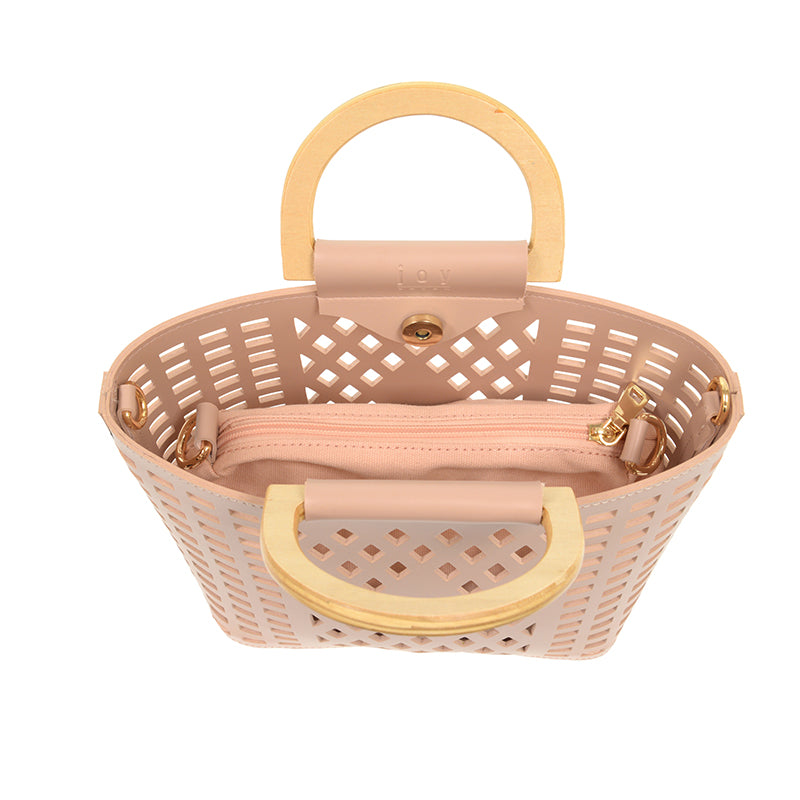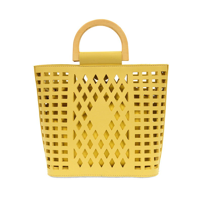 THIS STYLISH AND SUMMERY BASKET TOTE ACCENTED WITH REAL WOOD HANDLES WILL HAVE YOU READY FOR CAREFREE DAYS AHEAD. THE TOTE IS MADE IN LASER CUT VEGAN LEATHER AND HAS AN OPEN AIRY LOOK, BUT YOUR BELONGINGS ARE KEPT SAFE AND SECURE IN THE INCLUDED ZIPPERED POUCH INSIDE.
