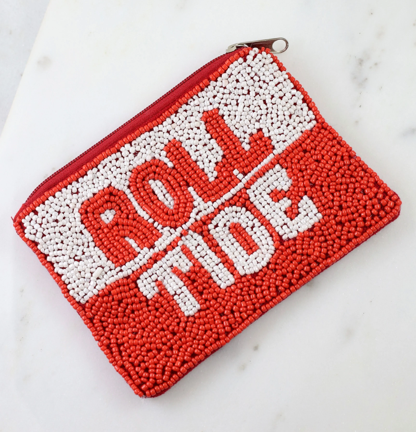 Roll Tide Roll! This beaded coin pouch is for all Alabama sports fans! Throw it in your purse or clear bag to take with you to games. It also has a top zipper.
