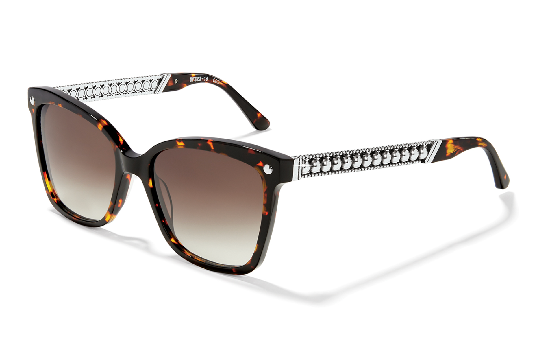 With a butterfly-shaped frame shaped frame, these sunglasses are casual but chic and feminine. The temple detail features a pierced/open design with rows of rounded studs – 2 tiny rows with a large row in the center. The front corners of the frame mimic the look with a silver stud as well. The very dark and gorgeous tortoise color looks nearly black, but lets little glints of light come through that soften the look.