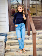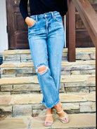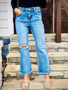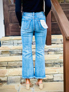 These high rise crop bootcut frayed jeans are designed for a comfortable and stylish fit. With a high rise waist and a cropped bootcut silhouette, these jeans elongate your legs and provide a flattering shape. The frayed hem adds a trendy touch to these versatile jeans. Perfect for any occasion, these jeans are a must-have in your wardrobe.