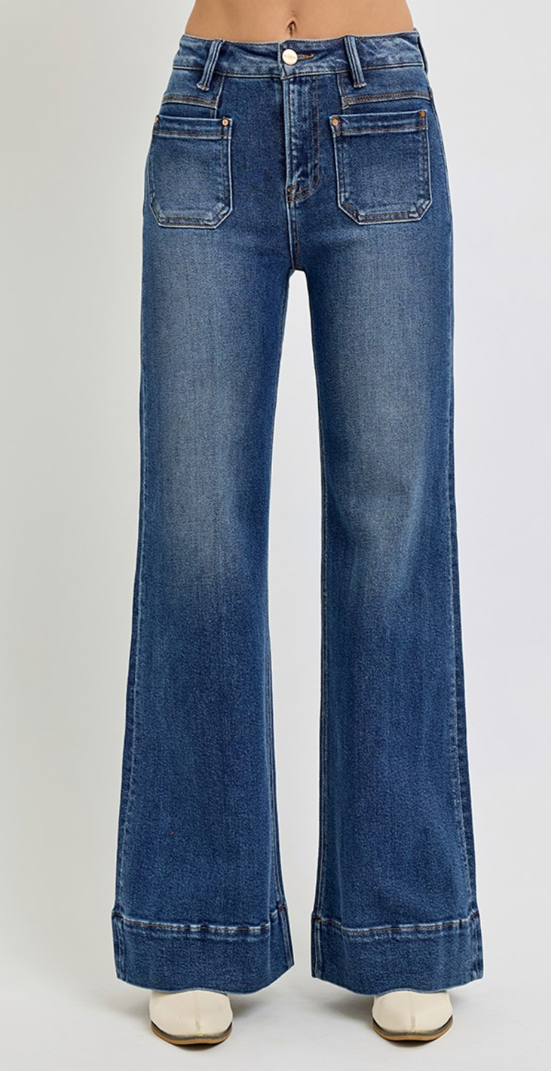 HIGH RISE WIDE FLARE PATCH POCKET JEANS BY RISEN