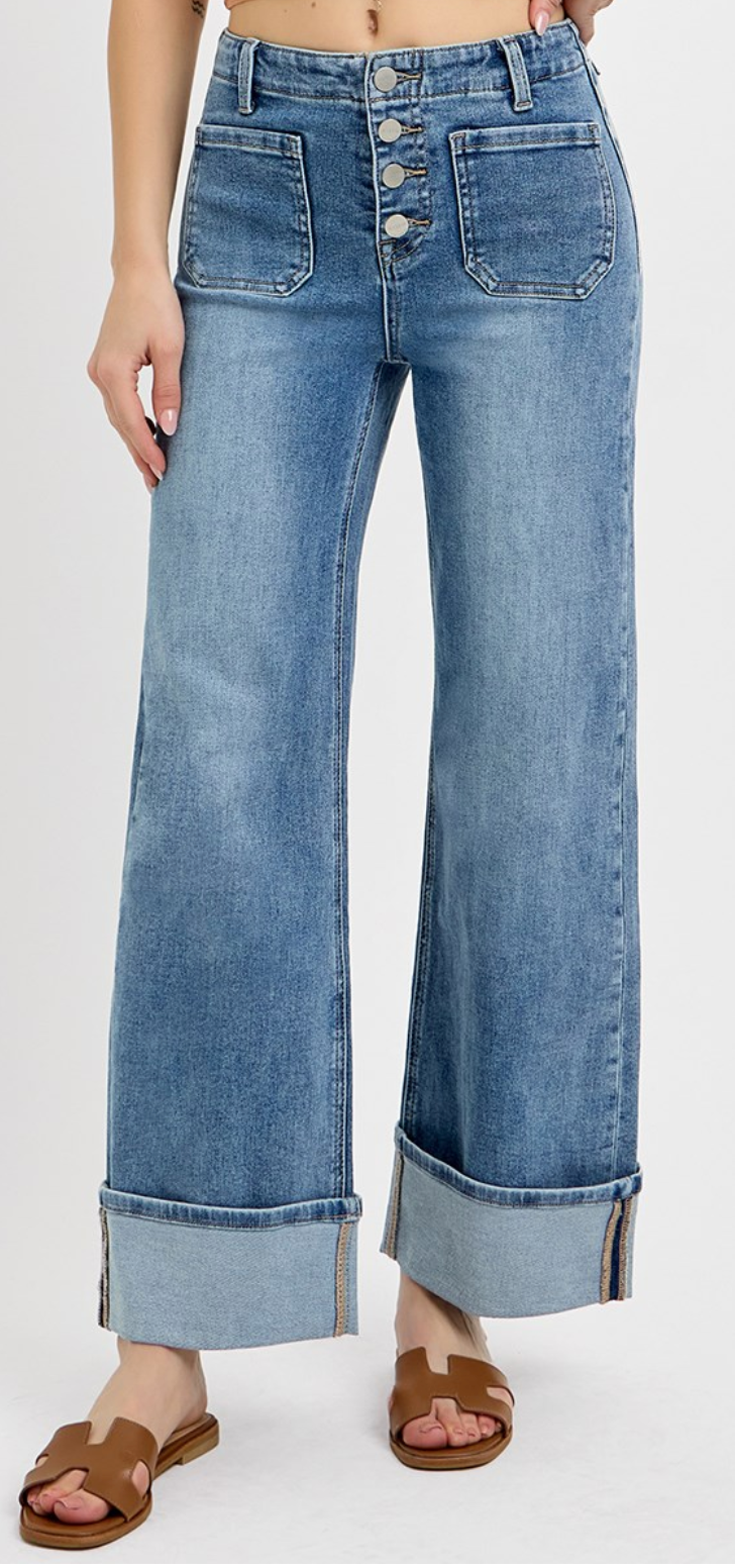 These high rise jeans feature a wide button down front, patch pockets, and cuffed ankles. With a classic and versatile design, these jeans offer a comfortable and stylish fit for any occasion. The high rise waistline provides support and a flattering silhouette, while the cuffed ankles add a trendy touch. Perfect for any fashion-forward individual.