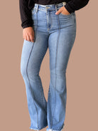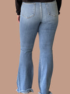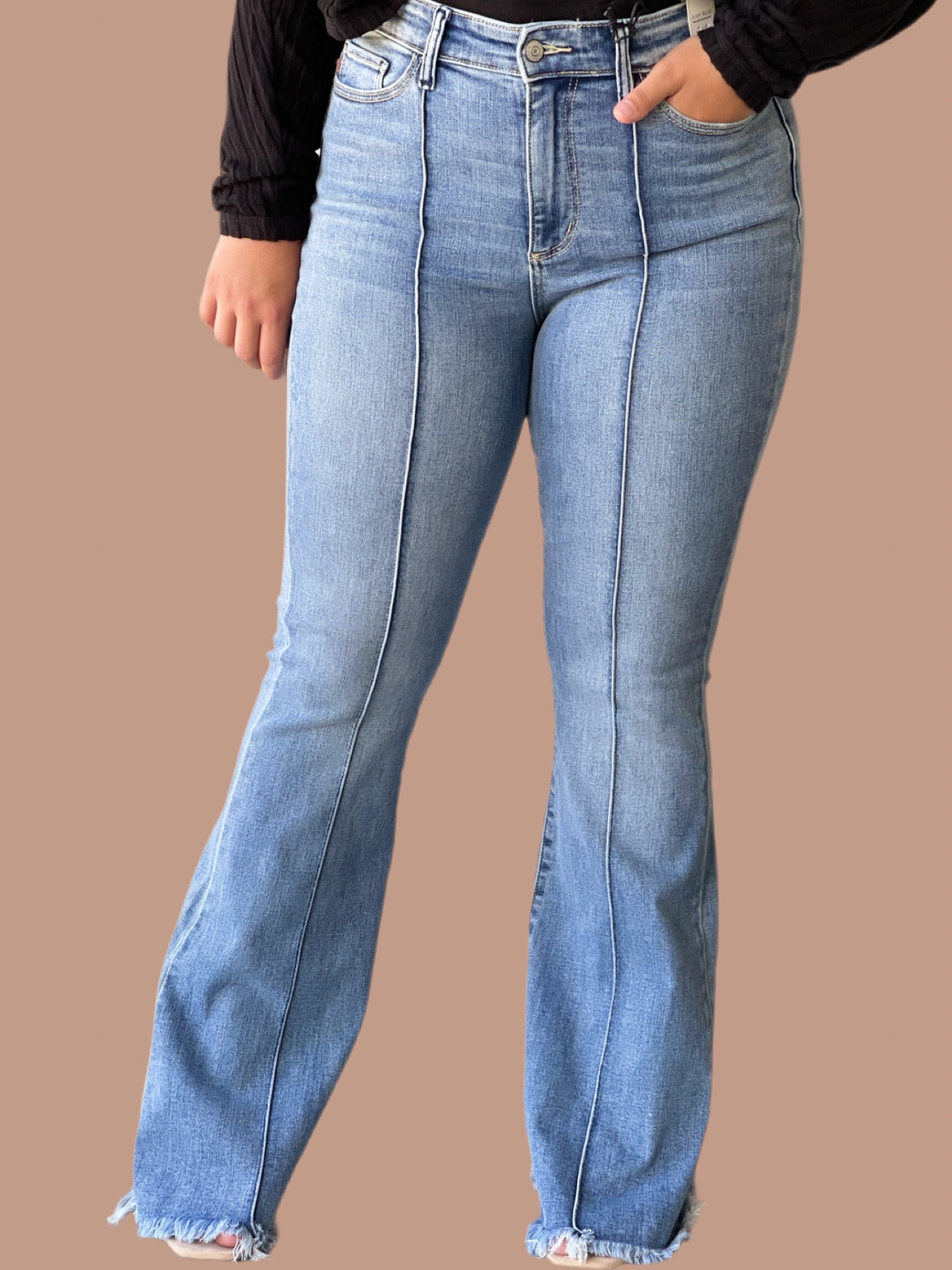 The Flare Factor Pants by Judy Blue feature a blend of 93% cotton, 6% polyester, and 1% spandex, ensuring both comfort and flexibility. Their high waist and elongating center seam create a flattering silhouette, while the front pintuck detail and frayed hem add subtle vintage-inspired accents. The trend-forward flared leg balances classic style with modern appeal. With a rise of 10 3/4" and a 33" inseam, these pants offer a refined fit that combines timeless design with contemporary stretch.